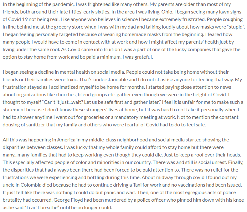 All this was happening in America in my middle-class neighborhood and social media started showing the disparities between classes. I was lucky that my whole family could afford to stay home but there were many...many families that had to keep working even though they could die. Just to keep a roof over their heads. This especially affected people of color and minorities in our country. There was and still is social unrest. Finally, the disparities that had always been there had been forced to be paid attention to. There was no relief for the frustrations we were experiencing and bottling during this time. About midway through covid I found out my uncle in Colombia died because he had to continue driving a Taxi for work and no vaccinations had been issued. It just felt like there was nothing I could do but panic and wait. Then, one of the most egregious acts of police brutality had occurred. George Floyd had been murdered by a police officer who pinned him down with his knee as he said “I can't breathe” until he no longer could.