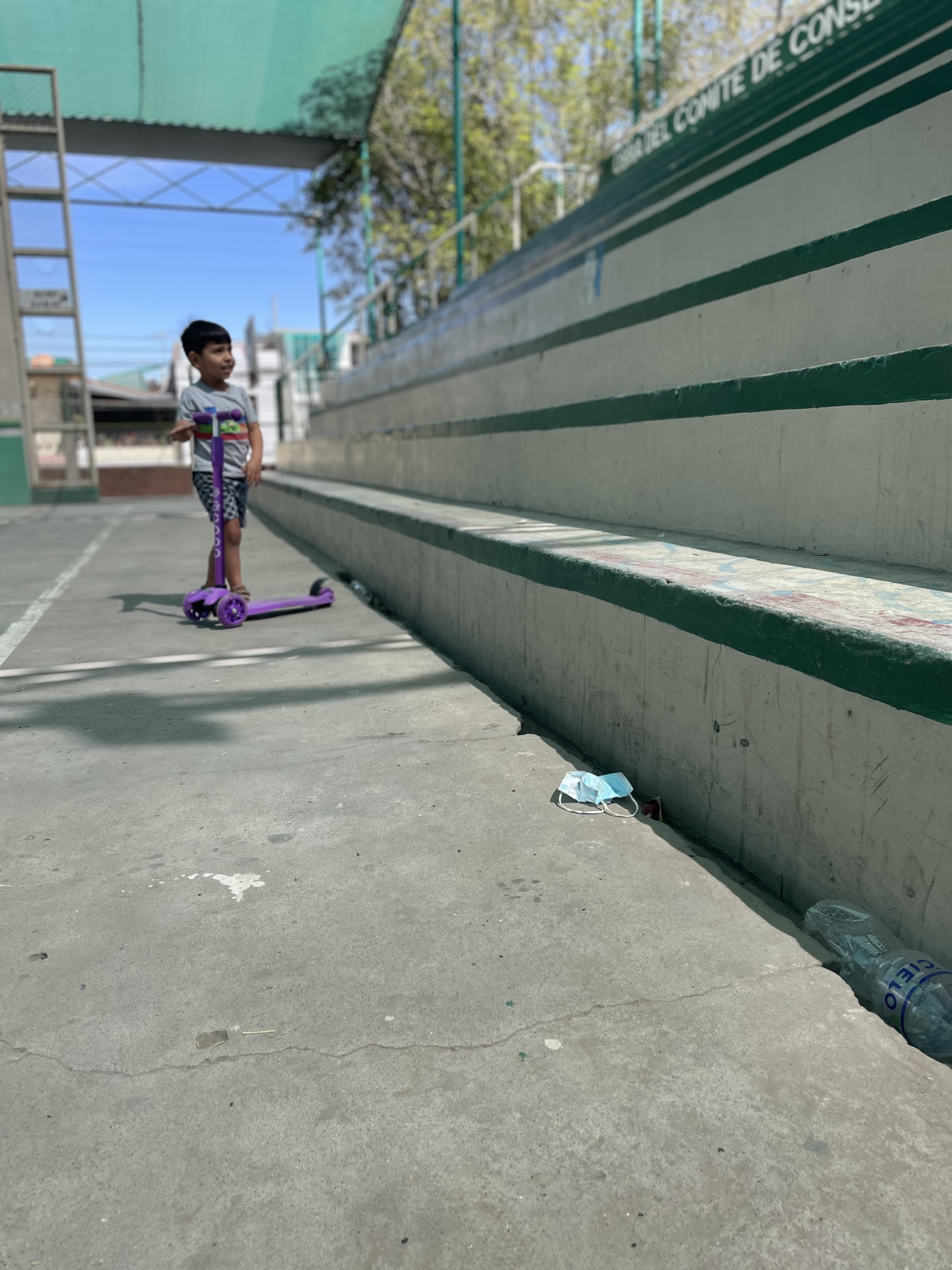 Mask trash on the football field at parque de la Independencia urb. 15 de enero