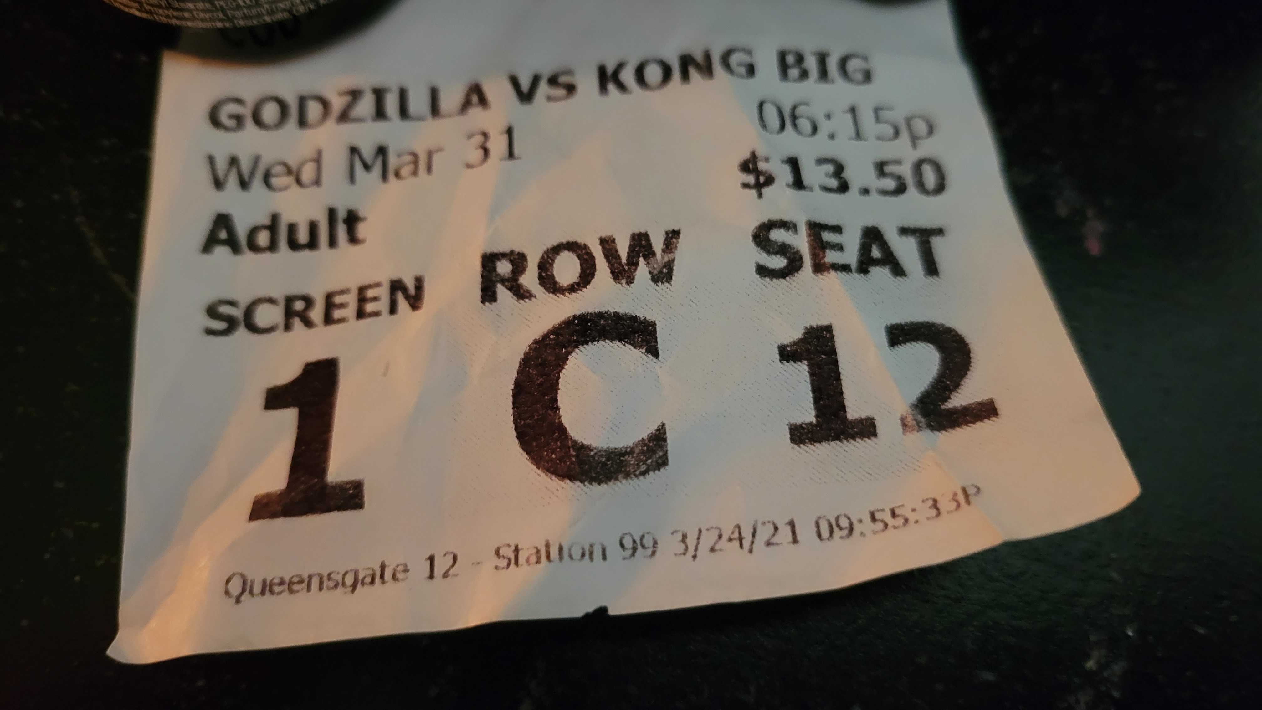 My pandemic object is a picture of the first movie ticket after the lockdowns of March 2020. Godzilla vs. Kong was meant to release in May 2020, but due to rewrites and the pandemic, it was pushed to November 2020 then to March 2021. Since the Godzilla franchise is my favorite movie franchise, it was only fitting that this was the first movie in theaters in a pandemic world. My dad, brother, and I traveled to the more comfortable Queensgate theater in Richland, Washington on the movie's premiere night. While I found the movie had some pacing issues and missing plot elements, I think that people needed an action-packed, fun monster movie to escape to. Two giant monsters fighting and destroying cities can be easier to deal with because we know it is not real, but they are tangible, we see the monsters. COVID is the opposite, it is real, but also an unseen threat without certain technologies. Godzilla and Kong have human characteristics we can identify with while COVID feels inhuman and impersonal. This is just something that I have noticed.