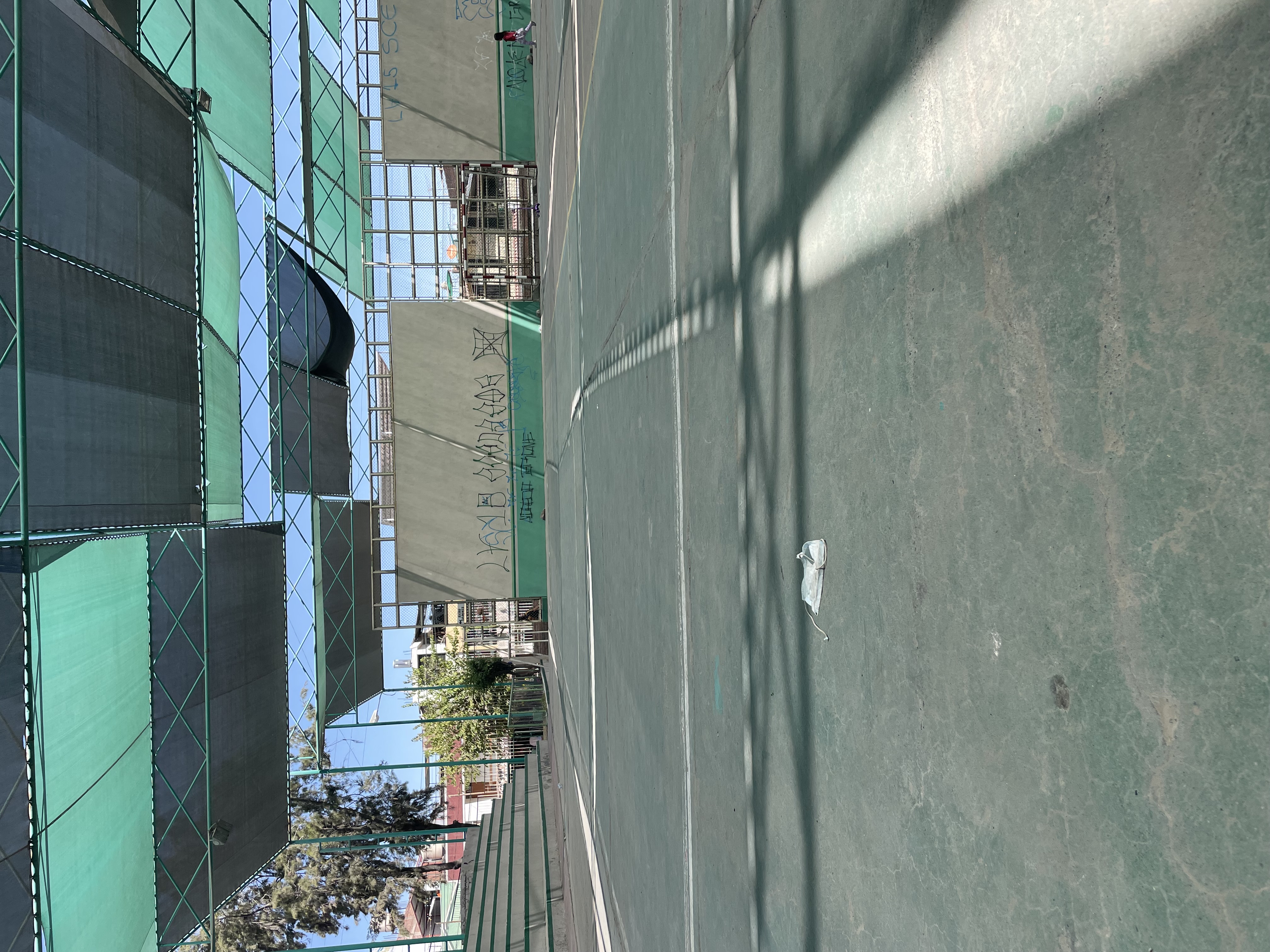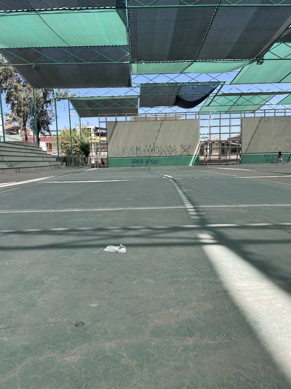 Disposable mask on soccer field, urb 15 de enero