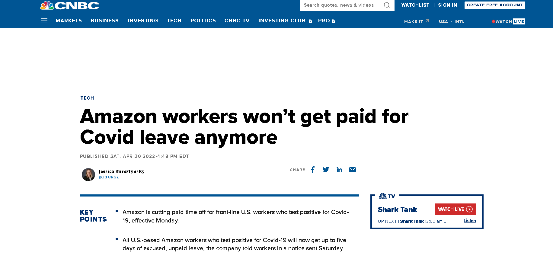This is a news story from CNBC News by Jessica Bursztynsky. Amazon is cutting pay for frontline workers that test positive for COVID. The new policy is that workers who test positive will now be given five days of unpaid, excused leave. Amazon added that workers waiting for Covid test results will no longer have time off excused since rapid tests are now widely available.
