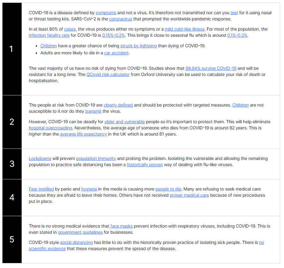 The item is a chart from evidencenotfear.org. It can be found on the homepage. This chart can be found under the “key facts” section and explains the information that is claimed to be from experts in epidemiology, microbiology, and virology. The key facts section contains information that is immediately concerning to me. Some of the statements that are the most concerning to me are that children cannot transmit the virus, face masks can create negative health effects for the person wearing them, and more people have died from the panic of COVID-19 than the virus itself. The chart contains links, which I assumed would provide evidence and research to back up the claims. However, each link leads to an archive of news articles that are related to that topic.