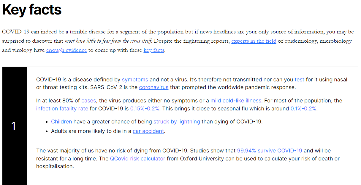This site is trying to use "science" and "medical" facts to push the narrative that COVID fears are unreasonable and scare tactics. My reaction when I see any article full of hyperlinks is to check them out as well as to fact check the main ideas separately. Sites like this assume that people will not take the time to look information up and take it at face value.