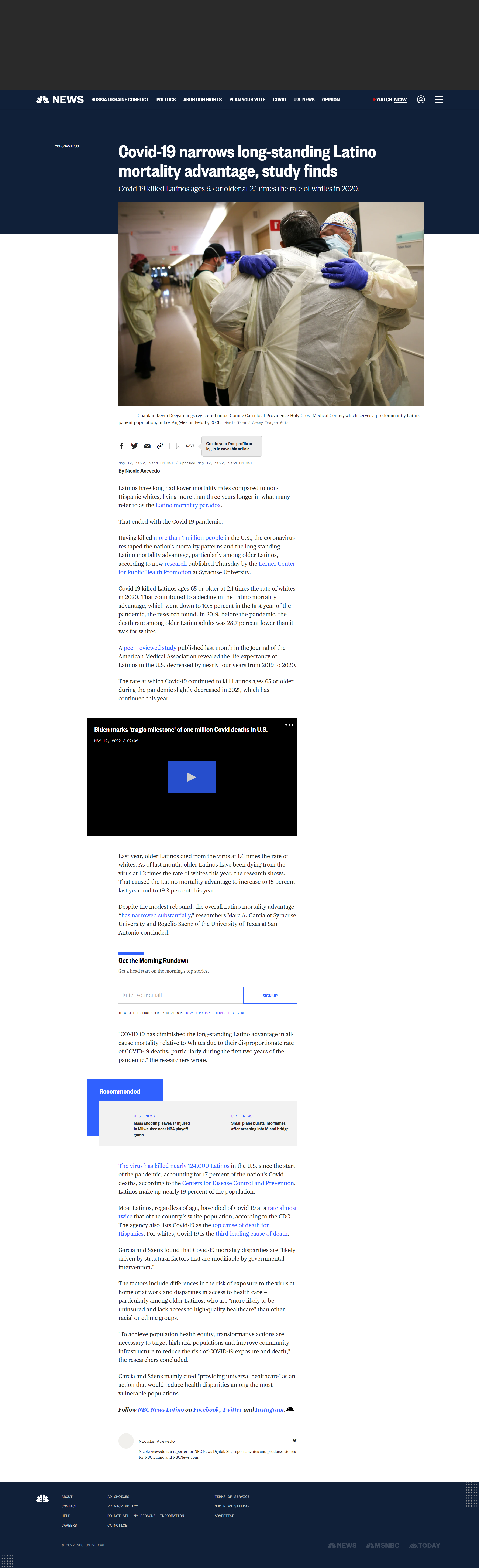 This is a news story from NBC News by Nicole Acevedo. Latinos have been shown to have lower mortality rates compared to non-Hispanic whites, where they live an average of three extra years. This changed with the virus. In a study published by the Lerner Center for Public Health Promotion, COVID-19 has been shown to kill Latinos 65 or older at 2.1 times the rate of whites in 2020. This number decreased slightly in 2021, which was at 1.6 times the rate of whites. So far this year, it has been at 1.2 times the rate of death. In total, COVID has killed 124,000 Latinos since the start of the pandemic in the United States, which accounts for 17% of deaths. The reason the Latino death rate is high is debated, but some say it is because Latinos in the United States are less likely to have access to quality healthcare or have jobs that would expose them to the virus more often.