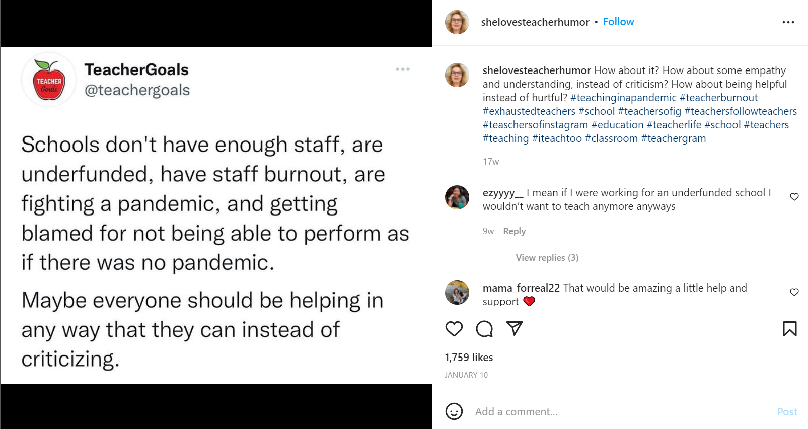 Even before the pandemic, many teachers have felt that they are underappreciated. During the pandemic, the number of responsibilities on teachers increased. They have been forced to teach during a health crisis, putting themselves at risk. When teachers are sick, the remaining teachers are forced to pick up the work without any empathy if they are not able to fulfill all obligations. The expectations have increased as teachers are also battling increasing behavior issues.