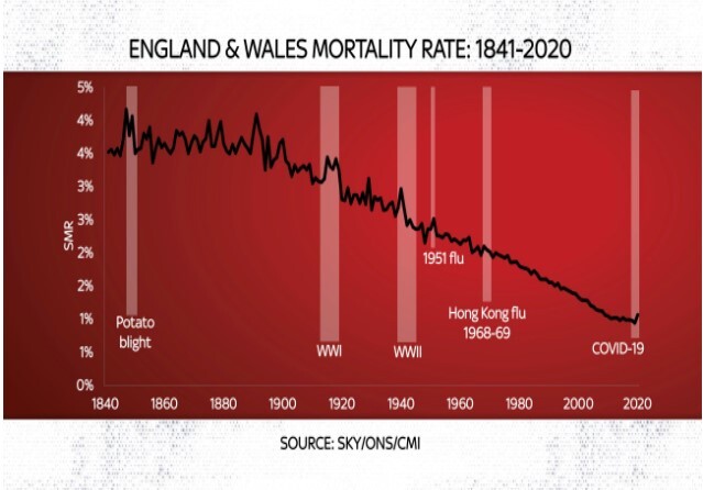 The attached image was used as evidence in an article for pandemic skeptics to make a "realistic risk assessment" of their danger during the COVID-19 pandemic in an article originally published in March 2021. The image utilizes only the mortality rate of England and Wales over the last century to visually "show" that COVID-19 is just a "blip" on the map. They are seemingly hinting through an image that this pandemic is fake news compared to world wars or influenza, using data to propagandize skepticism. What is misleading about this data is that they are using numbers of today against nearly one hundred years ago and are not contextualizing the numbers at all. At first glance one can see the overall mortality rate is going down. Of course, this is due to improved science, sanitization, water, and medicine over this time period. We must not also forget that this rate has gone down because the number of people in England and Wales, as in all life on our Earth, has increased. Like all math problems, the larger the denominator the small the rate. For example, if 100 people died out of a population of 1,000, the mortality rate is 10% (100/1000x100). But, if 100 people died in a population of 10,000, the mortality rate is only 1 percent (100/10000x100). Trying to compare numbers in a situation where the world population is much different and globalized, is not an equal comparison. I believe this is misleading persuasive propaganda that skeptics used to make COVID look like not a big deal. However, the risk factors have much more to do with your age, location, health history, interaction with other people, and how your surrounding areas respond to a pandemic, none of which is contextualized in this vague graph.