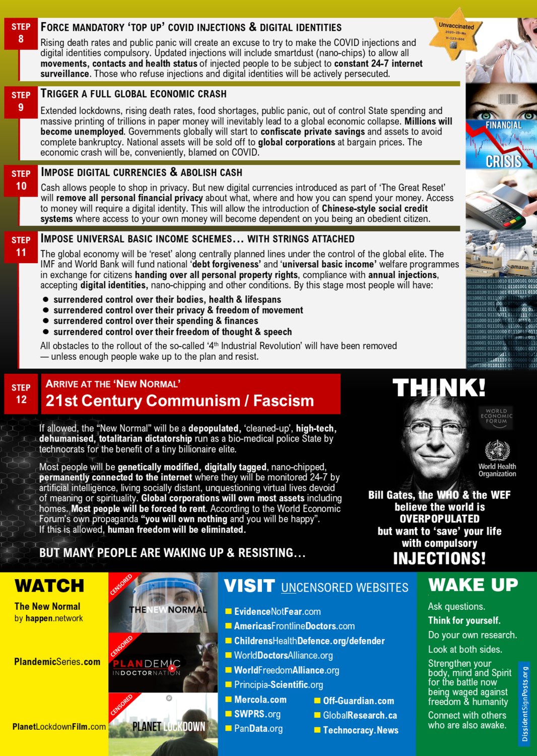 This double-sided A4 leaflet provides an extended summary overview of the supposedly 12-step plan behind the COVID. This leaflet was taken from the dissidentsignposts.org, and they hope to inform people about the “real” reason behind the COVID pandemic. This leaflet says that the billionaires want to impose new ways for global corporations but for their plan to work, they need to acquire everyone to be tagged with a unique digital identity number and surrender their privacy. As this leaflet points out, the “New Normal” that billionaires want to accomplish is to be depopulated, cleaned-up, high-tech, dehumanized, totalitarian dictatorship, genetically modified, digitally tagged, nano-chipped, etc. this leaflet tries to persuade the audience by pointing out that the COVID pandemic is just a big scheme in hopes of taking control of the total population. The 12 step that is mentioned explains the different reasons why the government is pushing for people to take COVID and the vaccines seriously. I have heard of this idea before from my friends. They were talking about it, but to me, I believe that COVID is real. I have seen my family members getting infected by the virus. I will never believe things like this and I will never let anybody put a chip or something within me. Although our world is getting more and more highly advanced, I believe that this so-called “Great Reset” will not take place.