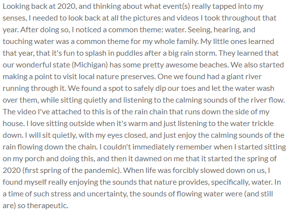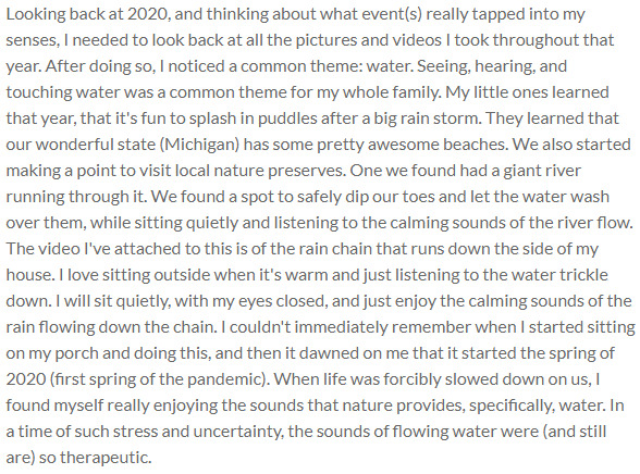 Looking back at 2020, and thinking about what event(s) really tapped into my senses, I needed to look back at all the pictures and videos I took throughout that year. After doing so, I noticed a common theme: water. Seeing, hearing, and touching water was a common theme for my whole family. My little ones learned that year, that it's fun to splash in puddles after a big rain storm. They learned that our wonderful state (Michigan) has some pretty awesome beaches. We also started making a point to visit local nature preserves. One we found had a giant river running through it. We found a spot to safely dip our toes and let the water wash over them, while sitting quietly and listening to the calming sounds of the river flow. The video I've attached to this is of the rain chain that runs down the side of my house. I love sitting outside when it's warm and just listening to the water trickle down. I will sit quietly, with my eyes closed, and just enjoy the calming sounds of the rain flowing down the chain. I couldn't immediately remember when I started sitting on my porch and doing this, and then it dawned on me that it started the spring of 2020 (first spring of the pandemic). When life was forcibly slowed down on us, I found myself really enjoying the sounds that nature provides, specifically, water. In a time of such stress and uncertainty, the sounds of flowing water were (and still are) so therapeutic.