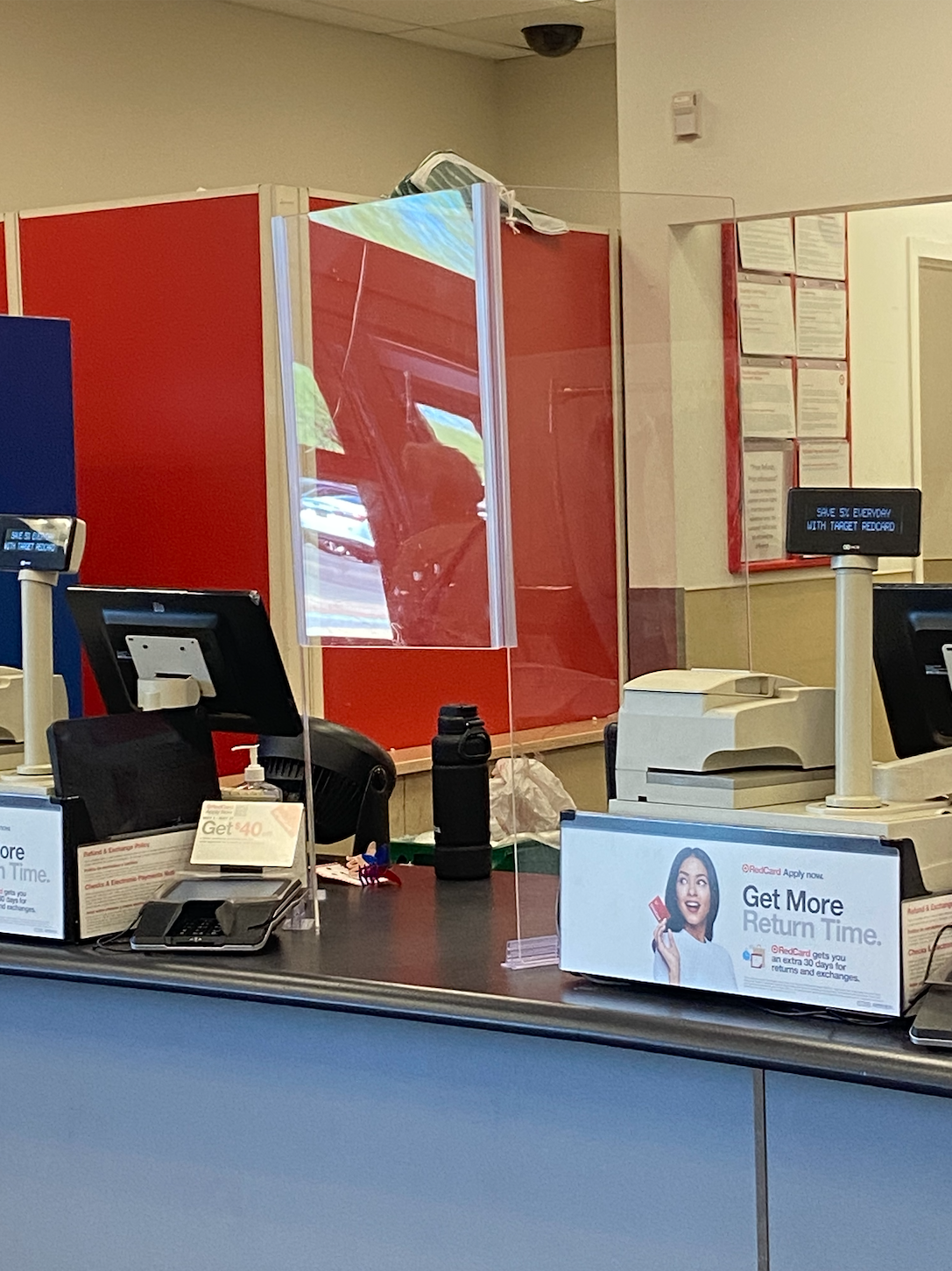 This is a sneeze guard seen at Target. This is a COVID-era restriction meant to prevent the spread of COVID. Even though most restrictions are gone, these are still up.