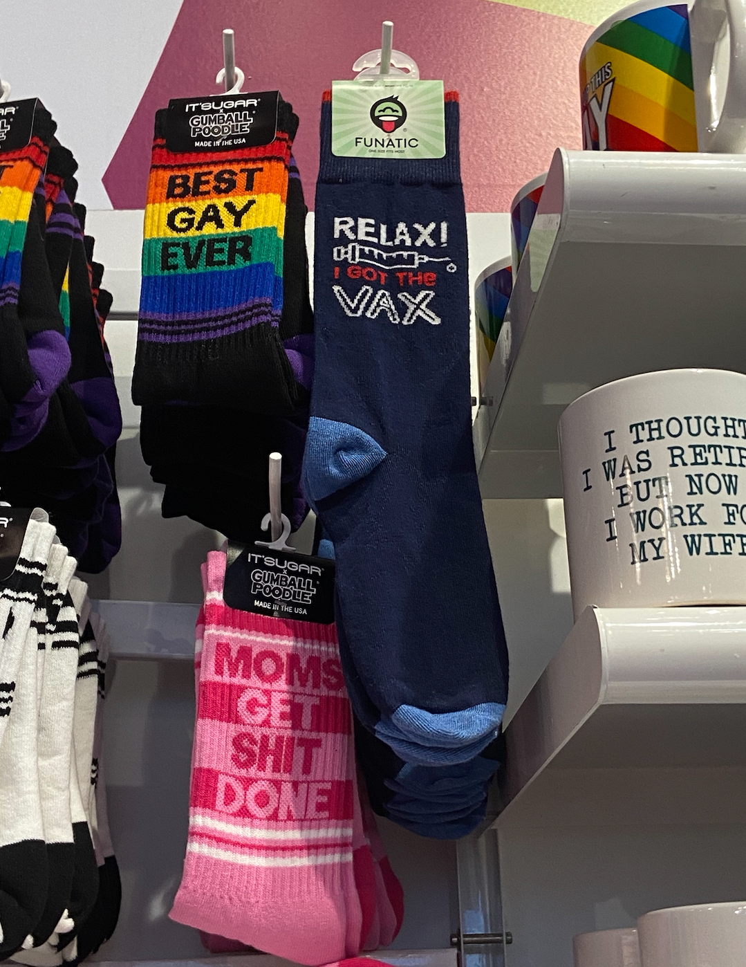 This is a pair of socks I found at It's Sugar. They say "Relax! I Got the Vax" on them. This is referencing the COVID vaccines people have gotten. Now, places are selling merchandise referencing it as a way to get more money. Things like this are not uncommon and many big stores will sell vaccine related merchandise. I have no idea how well it actually sells, but there must be some market out there for companies to keep producing it.