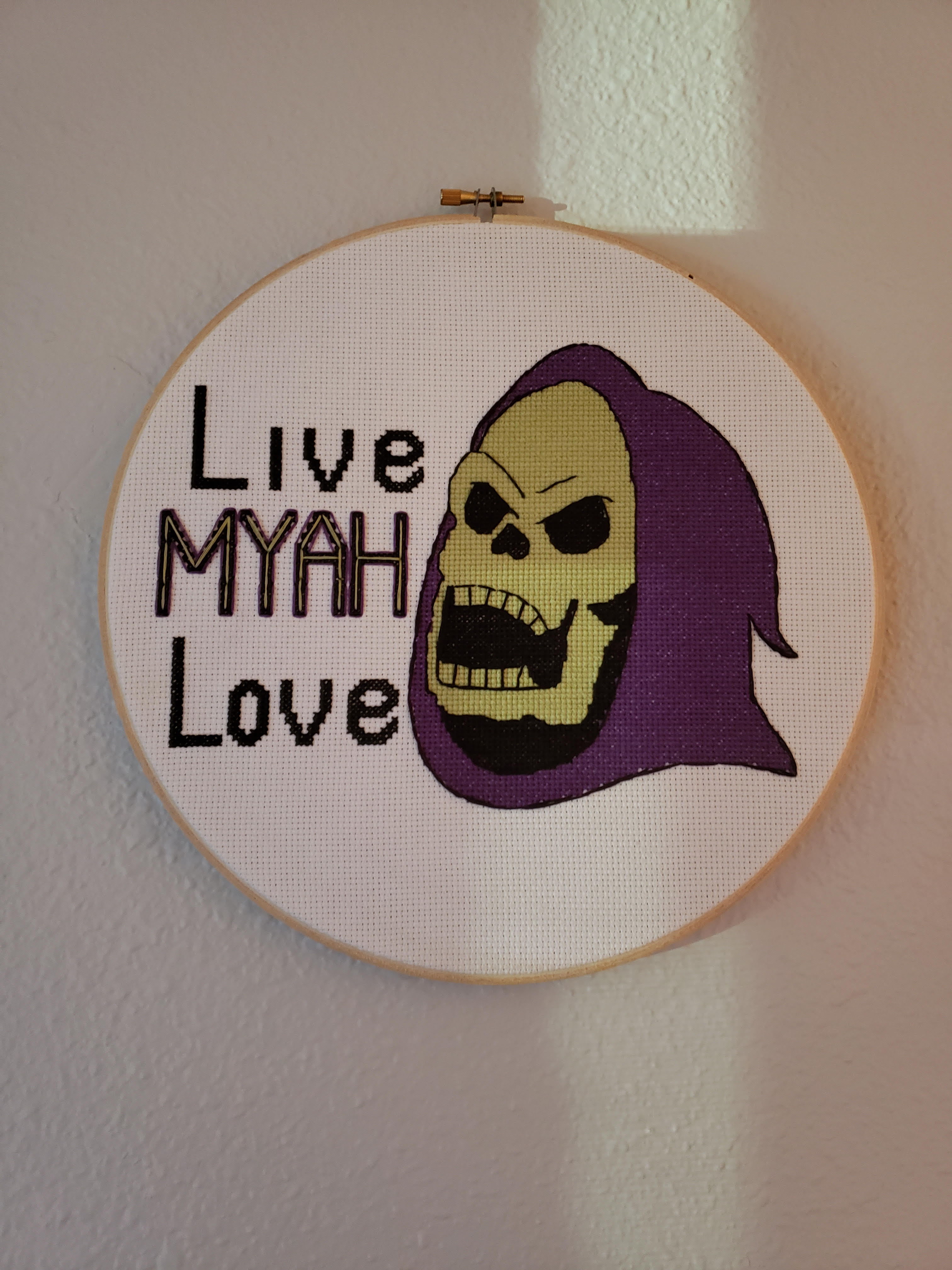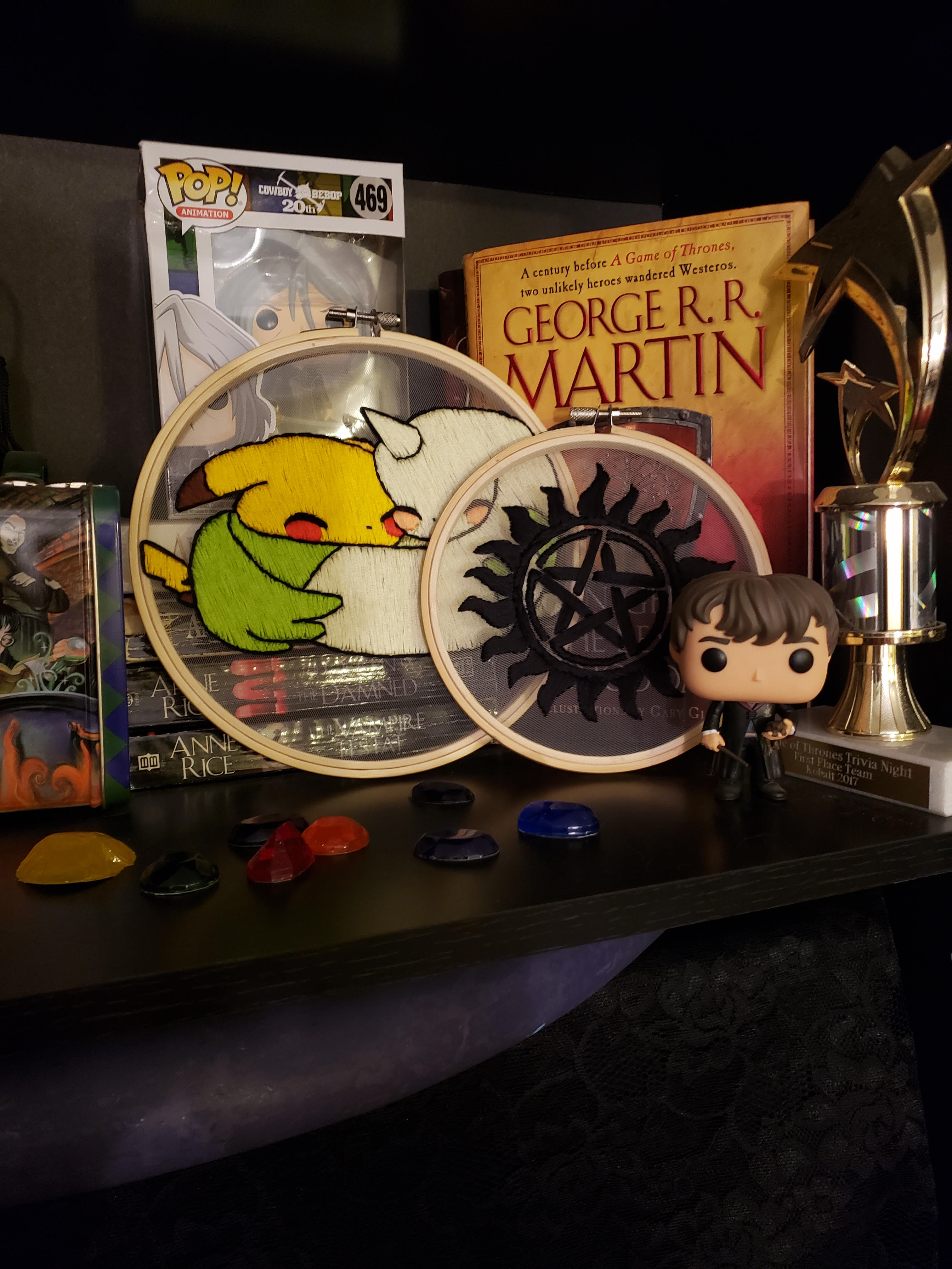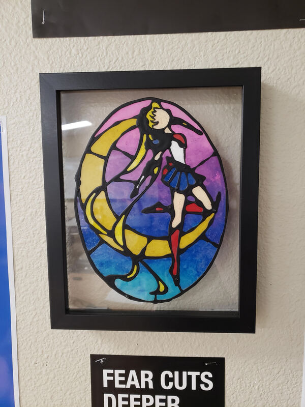 When quarantine hit, that is what was left to me. So that is what I did. Fortunately, crafters are notorious hoarders, so that was one thing I struggled little to find when the shelves at all the stores were bare. Whatever it was, it was already in my craft room. When you couldn't find masks anywhere, me and my loved ones never had to worry. I sewed probably 100 from the leftovers I had from a few of my quilts, fun masks with swirling DNA strands, dinosaurs, and Bat-signals. When we couldn't get toilet paper and mom my had to mail me some from out of state, I sent her a giant cross-stitch of her favorite character (Snoopy) as a thank you for being my toilet paper hero. I didn't stop there though. I had to make videos daily for the kids in my (now) virtual classes. So I went from being the women who crocheted in meetings, to the one who painted herself to look like different characters during meetings. (The first student to comment with who I was dresses as that day only had to do half the day's assignment.) The other meeting participants would periodically make me turn my camera on to check on the progress of my transformation. Crafting was really the only thing left to me, what with lockdowns, my school going virtual, the inability to access basic necessities, and the persistent taboo on leaving the house. Crafting got me through it. I made so many things, simply because I needed to be doing something. I sewed, mod podged, and wire wrapped, papier mached, and glass painted, until every wall and surface in my home (and some in my classroom) were covered. Often I'd have the TV on in the background so I'd have noise for company. I'd craft into the wee hours, because it's not like I could go anywhere in the morning. It got so bad that my housemate (a dear friend and fellow transplant with no family in Arizona, we moved in together a week before COVID struck because neither of us wanted to live alone) Kristen had to stage a crafting intervention of the "No really, we are out of space. For the love of God, knock it off or get an Etsy store" variety. (I then switched to baking because I don't know how to be if my hands are still. I was accused instead of trying to make her fat.)