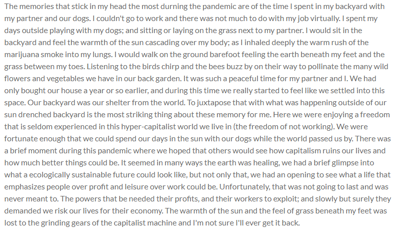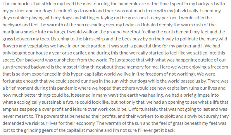 The memories that stick in my head the most durning the pandemic are of the time I spent in my backyard with my partner and our dogs. I couldn't go to work and there was not much to do with my job virtually. I spent my days outside playing with my dogs; and sitting or laying on the grass next to my partner. I would sit in the backyard and feel the warmth of the sun cascading over my body; as I inhaled deeply the warm rush of the marijuana smoke into my lungs. I would walk on the ground barefoot feeling the earth beneath my feet and the grass between my toes. Listening to the birds chirp and the bees buzz by on their way to pollinate the many wild flowers and vegetables we have in our back garden. It was such a peaceful time for my partner and I. We had only bought our house a year or so earlier, and during this time we really started to feel like we settled into this space. Our backyard was our shelter from the world. To juxtapose that with what was happening outside of our sun drenched backyard is the most striking thing about these memory for me. Here we were enjoying a freedom that is seldom experienced in this hyper-capitalist world we live in (the freedom of not working). We were fortunate enough that we could spend our days in the sun with our dogs while the world passed us by. There was a brief moment during this pandemic where we hoped that others would see how capitalism ruins our lives and how much better things could be. It seemed in many ways the earth was healing, we had a brief glimpse into what a ecologically sustainable future could look like, but not only that, we had an opening to see what a life that emphasizes people over profit and leisure over work could be. Unfortunately, that was not going to last and was never meant to. The powers that be needed their profits, and their workers to exploit; and slowly but surely they demanded we risk our lives for their economy. The warmth of the sun and the feel of grass beneath my feet was lost to the grinding gears of the capitalist machine and I'm not sure I'll ever get it back.