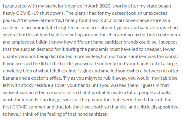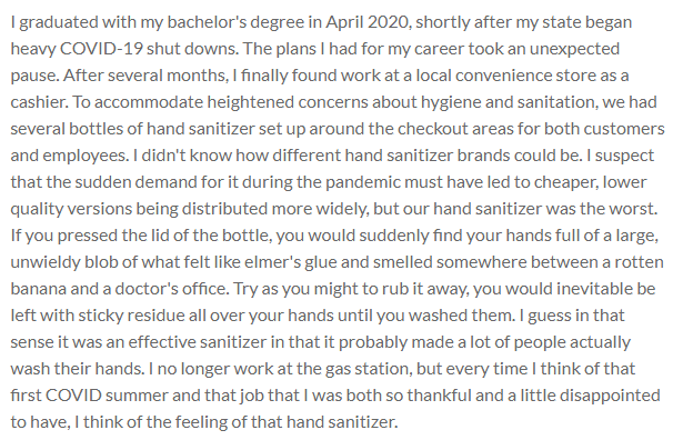 I graduated with my bachelor's degree in April 2020, shortly after my state began heavy COVID-19 shut downs. The plans I had for my career took an unexpected pause. After several months, I finally found work at a local convenience store as a cashier. To accommodate heightened concerns about hygiene and sanitation, we had several bottles of hand sanitizer set up around the checkout areas for both customers and employees. I didn't know how different hand sanitizer brands could be. I suspect that the sudden demand for it during the pandemic must have led to cheaper, lower quality versions being distributed more widely, but our hand sanitizer was the worst. If you pressed the lid of the bottle, you would suddenly find your hands full of a large, unwieldy blob of what felt like elmer's glue and smelled somewhere between a rotten banana and a doctor's office. Try as you might to rub it away, you would inevitable be left with sticky residue all over your hands until you washed them. I guess in that sense it was an effective sanitizer in that it probably made a lot of people actually wash their hands. I no longer work at the gas station, but every time I think of that first COVID summer and that job that I was both so thankful and a little disappointed to have, I think of the feeling of that hand sanitizer.