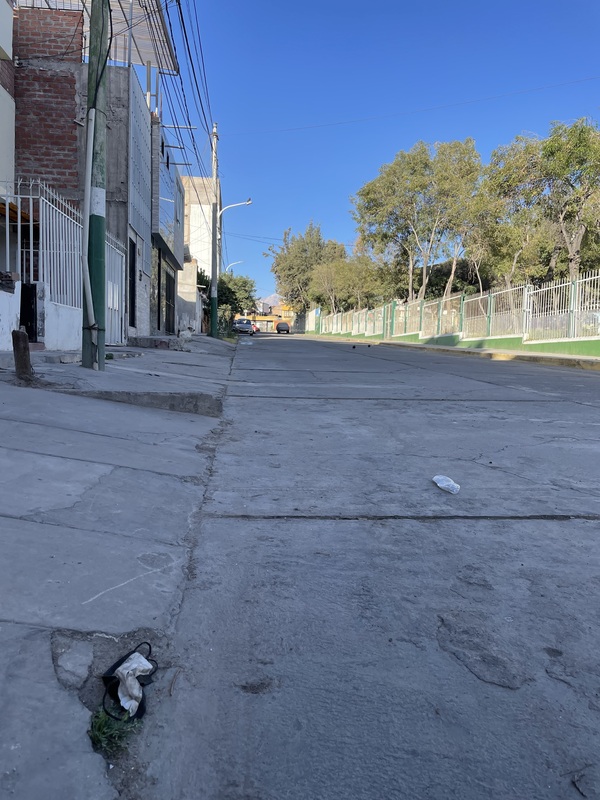 Picture of a black disposable mask in the street near Parque 15 de Enero de la Independencia in Arequipa, Peru.