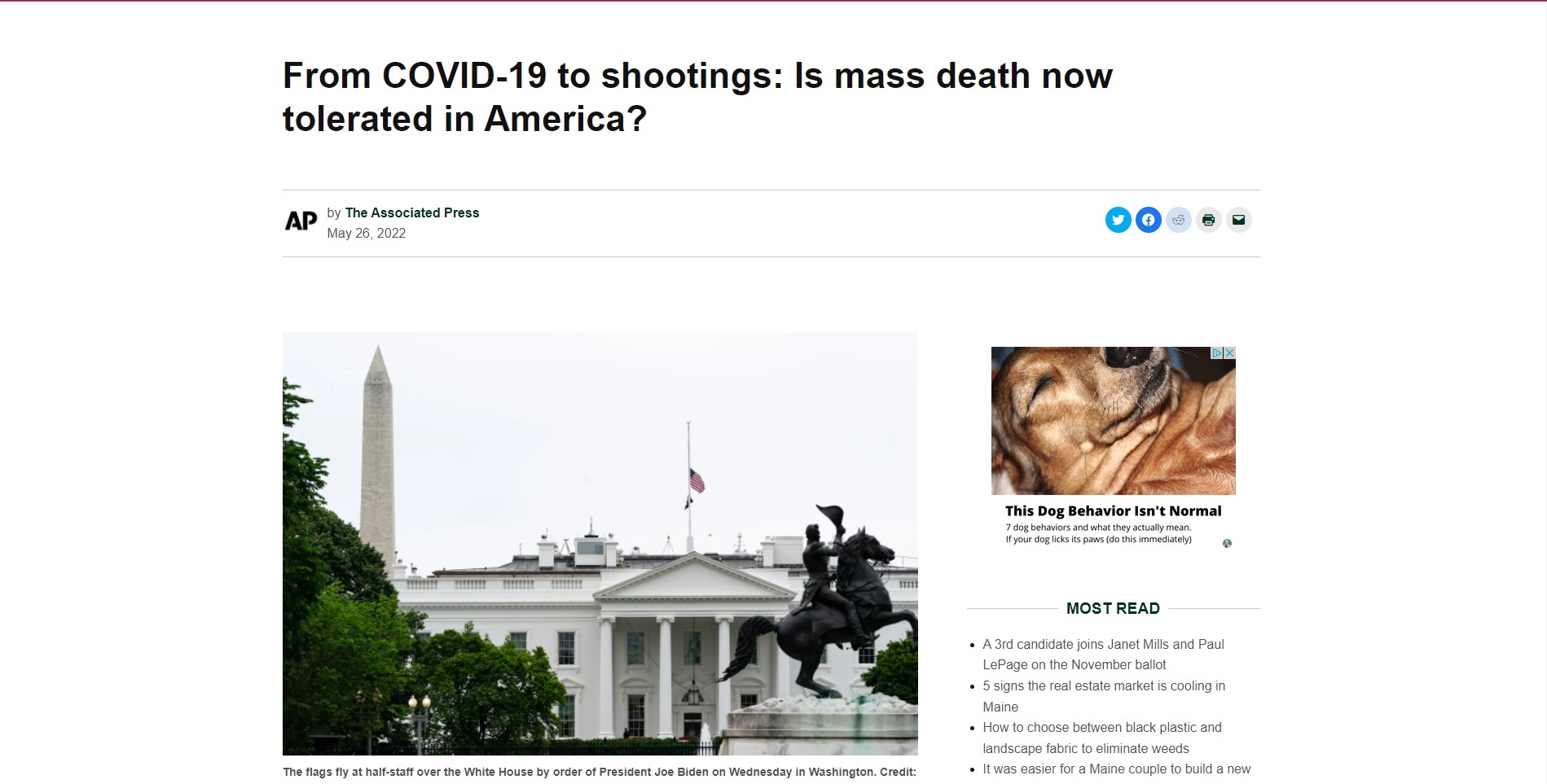 This is a news story from The Associated Press. Just recently, there have been over one million COVID deaths recorded in the United States. The author of this piece asks if Americans have just begun to tolerate mass death. Racial and social inequalities are also cited, where the author claims that those of certain backgrounds are more likely to die sooner or more violently. The COVID deaths are then related to the recent shooting deaths, such as in Buffalo and in Texas. While the gun violence deaths are lower than the COVID deaths, the author uses this to show that little is being done for either to help lessen the amount of deaths.