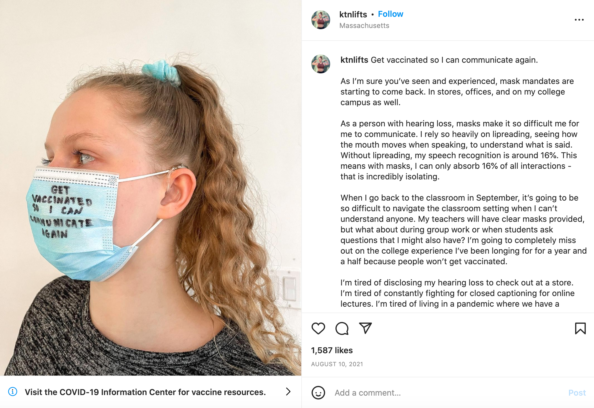 When I go back to the classroom in September, it’s going to be so difficult to navigate the classroom setting when I can’t understand anyone. My teachers will have clear masks provided, but what about during group work or when students ask questions that I might also have? I’m going to completely miss out on the college experience I’ve been longing for for a year and a half because people won’t get vaccinated.
