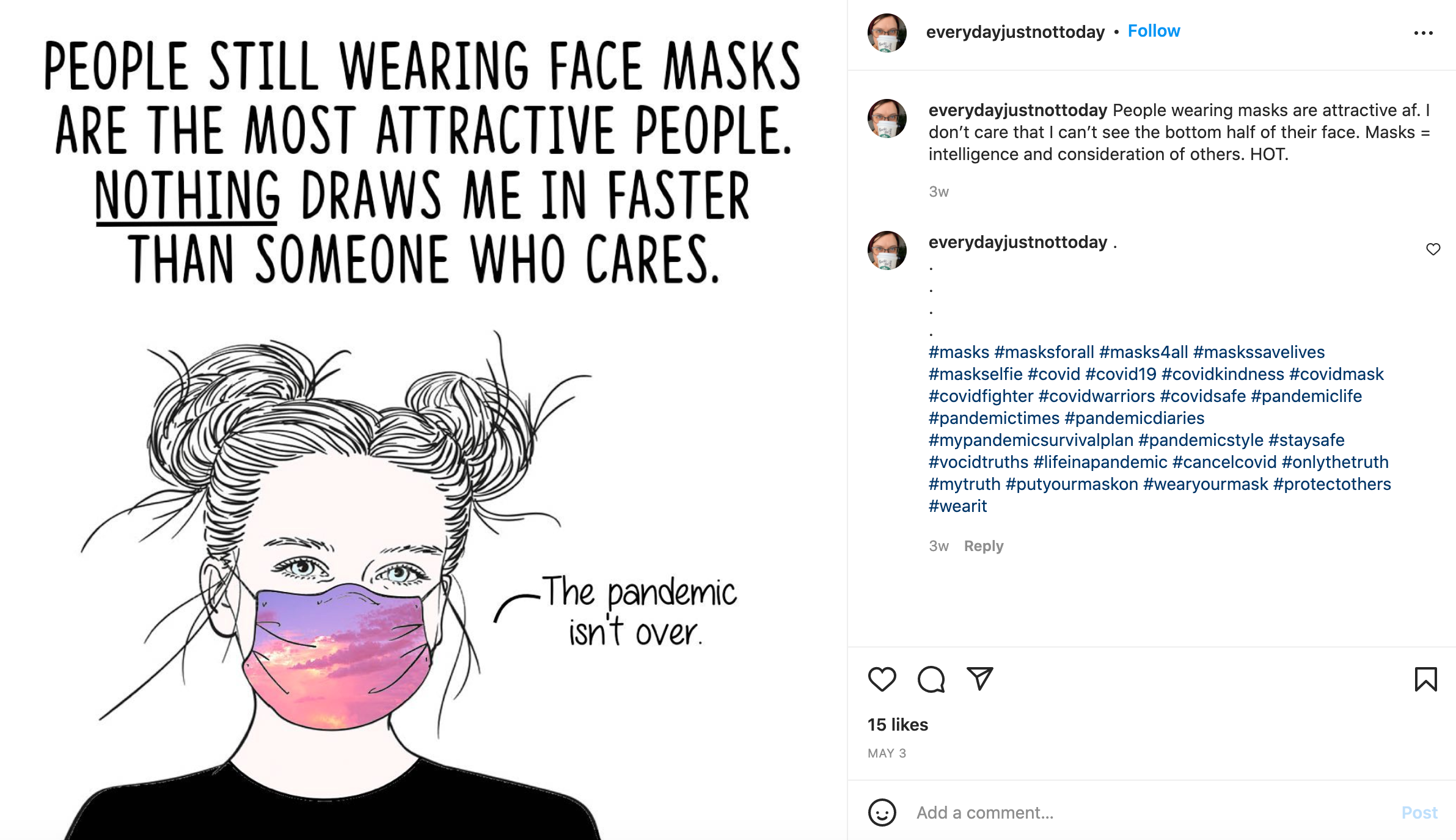 This is an Instagram post by everydayjustnottoday. The person that posted this equates masks with intelligence. Intelligence to this person is attractive. Masks have been a controversial topic due to the belief that they will inhibit communication or cause psychological issues. There are many different sides to this debate.