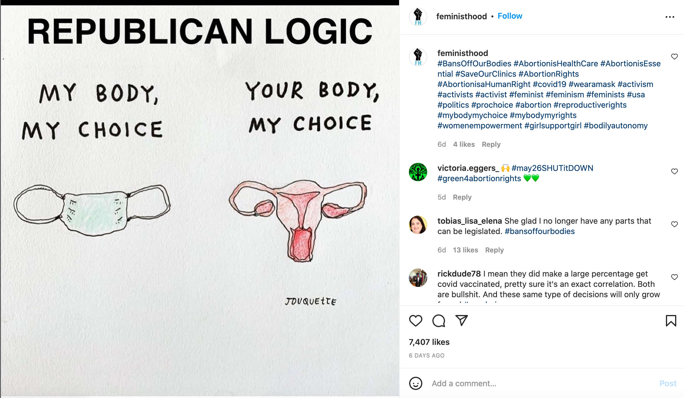 This is an Instagram post from feministhood. It is making the comparison between the rhetoric Republicans have had regarding COVID versus abortion. The person writing this says thinks that it is rather contradictory. The contradiction comes from thinking that "my body, my choice" applies to masks and vaccines, but should not apply to abortion. The commonality is that both issues deal with bodily autonomy.