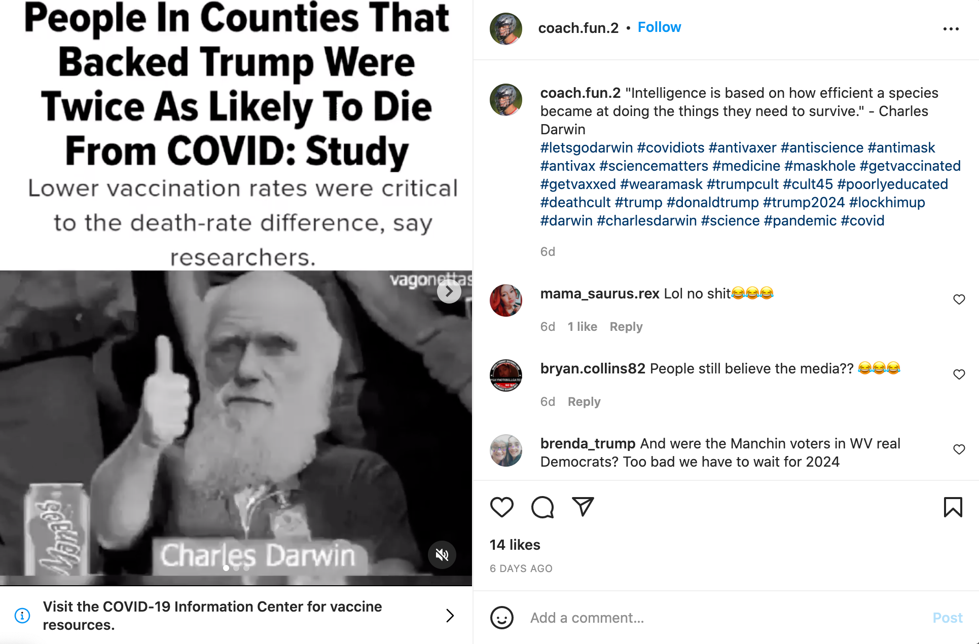 This is an Instagram post by coach.fun.2. The study is not linked in the description, but I did find the article the title is referencing. The story come from the Huffington Post. It says that political affiliation is linked to vaccination rates, which some claim are what is making the difference between living and dying from COVID. Wealth and access to certain care are also taken into account. The study was from Brown and the study claims that states that went heavily for Trump had more cases of COVID deaths.