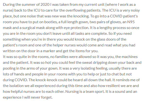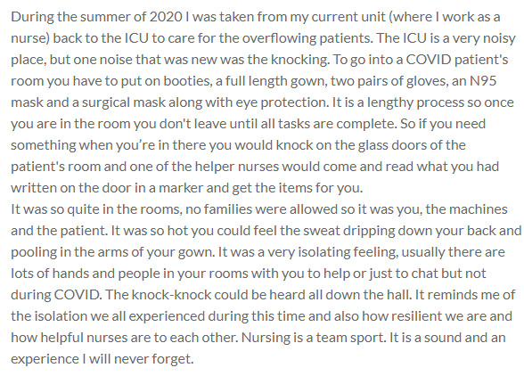 It was so quite in the rooms, no families were allowed so it was you, the machines and the patient. It was so hot you could feel the sweat dripping down your back and pooling in the arms of your gown. It was a very isolating feeling, usually there are lots of hands and people in your rooms with you to help or just to chat but not during COVID. The knock-knock could be heard all down the hall. It reminds me of the isolation we all experienced during this time and also how resilient we are and how helpful nurses are to each other. Nursing is a team sport. It is a sound and an experience I will never forget.
