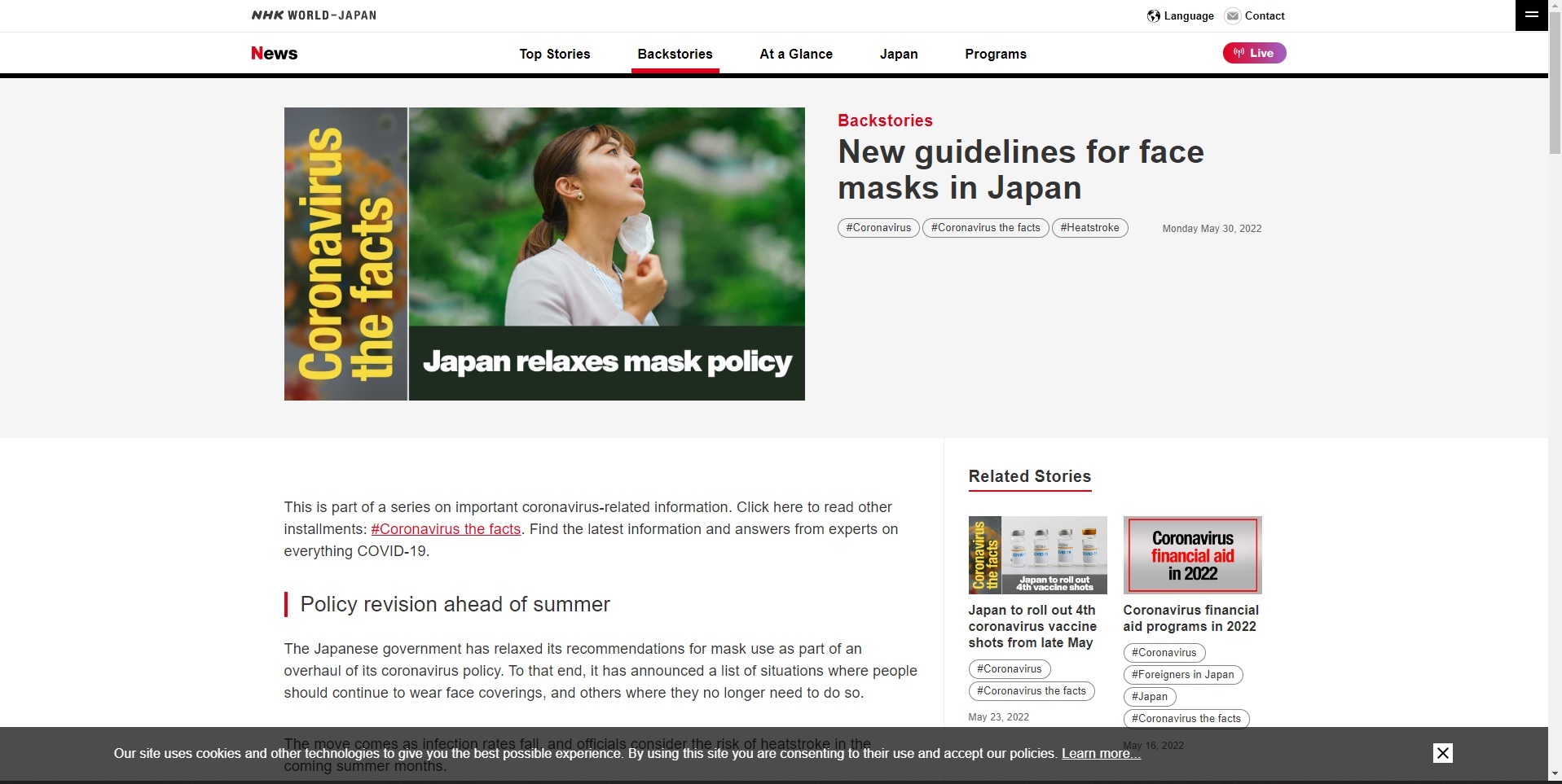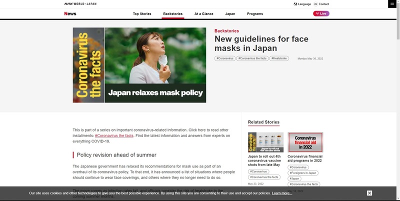 Japan, as of May 30th, 2022, is relaxing the face mask guidelines. For the most part, masks do not need to be worn outdoors except when the elderly are in close quarters to other people. Indoors, masks are still required indoors except in the case of when someone is in little to no conversation, which the article shows in a chart. The chart's example states walking around museums and libraries where there is little to no conversation. One of the reasons for why Japan is relaxing face masks is because summer is approaching and the temperature will rise. There are fears about face masks causing heatstroke. In Japan, temperatures can range from 70-90 degrees F, but the summers are hot and humid too. So, it makes sense to relax the restrictions, especially in the outdoors.