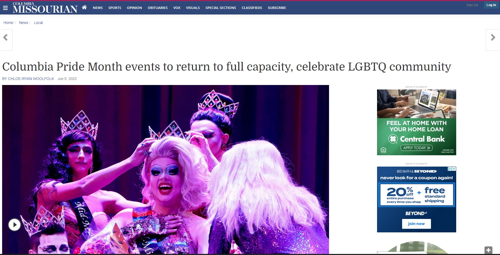 This is a news story from Columbia Missourian by Chloe-Ryan Woolfolk. After two years of either cancellations or limited capacities, Pride Month events in Columbia will be returning to full capacity. Listed in the article are local events that people can attend now, with lists of fees and general details.