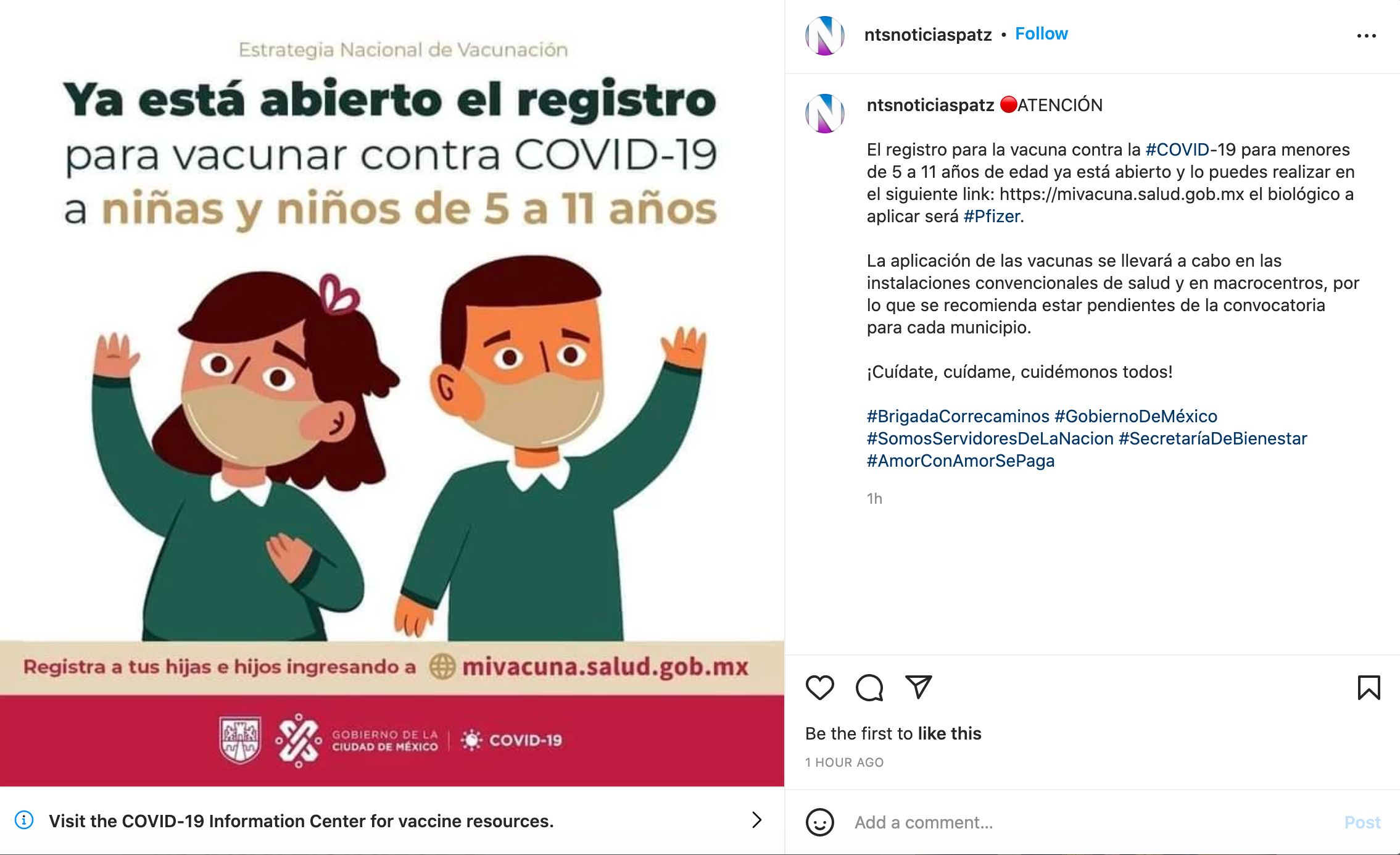 This is an Instagram post by ntsnoticiaspatz. It is saying that if you have not, you should register your kid to receive their vaccine. This is being promoted by the Mexican government.