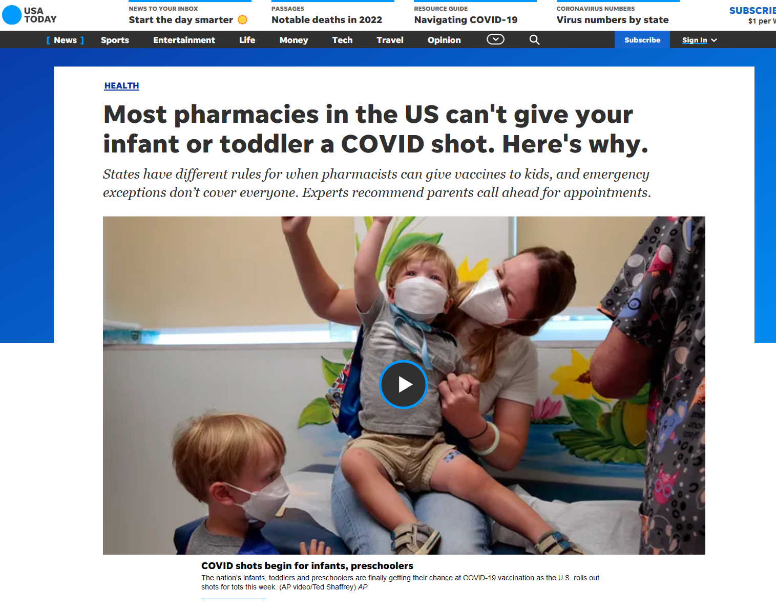 This is a news story from USA Today by Adrianna Rodriguez. Most US pharmacies don't allow their technicians to administer the vaccine to children under five. The age in which the vaccines can be ministered to younger kids varies, with most putting a minimum of five or above. A lot of the reason administering vaccines has been restricted, according to the article, is because not enough pharmacists are trained to give shots to children that young. The overall target is smaller, and the needle even shorter, in addition to needing to calm and anxious child. This makes people hesitant to give young kids the COVID vaccine. It is recommended that if you cannot find a pharmacy that will give the shot to very young kids that you ask your pediatrician for a one-on-one appointment for the vaccine.
