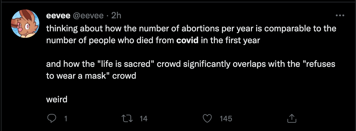 This is a tweet from eevee. This person is saying that those who refuse to wear masks are helping create as many COVID deaths as there are abortions per year. It is meant to point out the hypocrisy of people claiming "life is sacred" while being flagrant about wearing masks, which they argue is not pro-life.