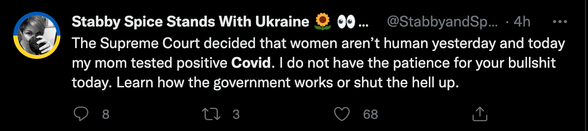 This is a tweet by StabbyandSpicy. This person is expressing their frustrations over their mom getting COVID, and the Supreme Court decision on Roe v. Wade being overturned.