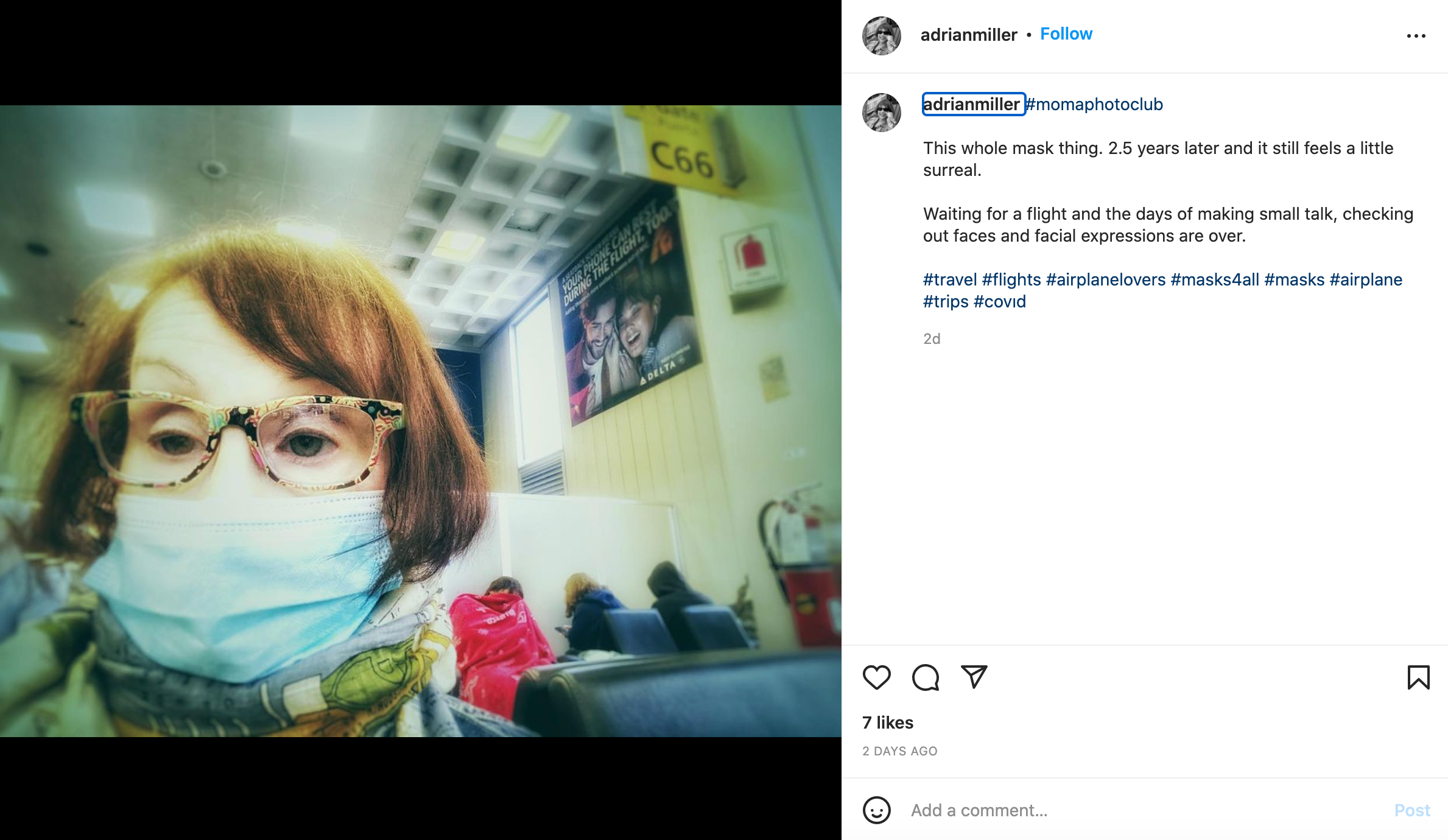 This is an Instagram post from adrianmiller. Here, she is recounting changes that have happened within the last 2.5 years of COVID. These changes include not making small talk or checking for people's facial expressions.