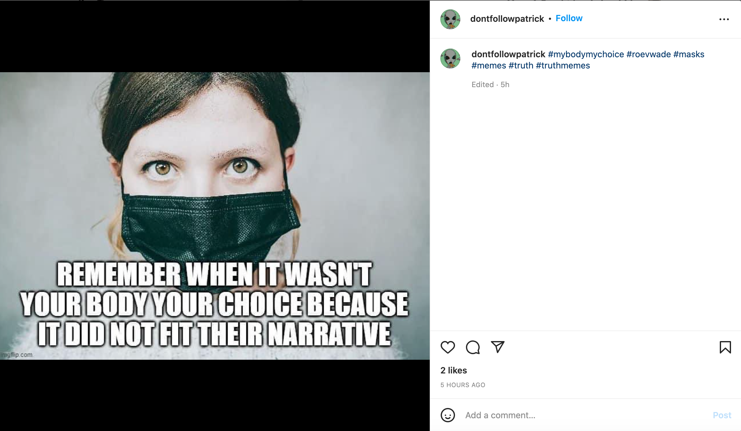 This is an Instagram post from dontfollowpatrick. This is a meme posted regarding bodily autonomy. For pandemic skeptics, "my body, my choice" has been common rhetoric with things like masks and vaccines. Dissenters claim that it is not a valid argument because the actions of one person in a public health crisis affect other people around them. With things like abortion, it is seen as an individual decision that does not affect others the way not wearing a mask would.