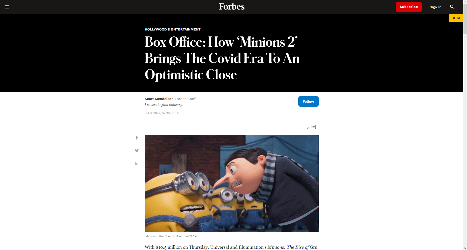This is a news story from Forbes by Scott Mendelson. This is an article that discusses the moviegoing habits of people pre and post-COVID. The article mentions that Minions: The Rise of Gru and Top Gun: Maverick were meant to come out in 2020, but they were delayed because of COVID. Due to the high amounts of attendance to both films, the author is speculating that audience members that may have forgone streaming new movies are coming back to theaters. The box office gross for both films has broken records.