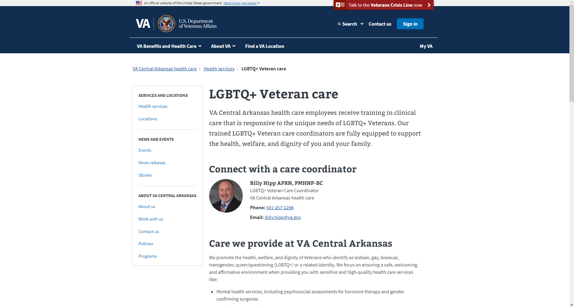 This is the Arkansas Veterans Affairs website listing specific resources for LGBTQ+ veterans in Arkansas. This site places a specific emphasis on Central Arkansas due to the heavy LGBTQ+ population in that area. In order to combat COVID-19, this site focuses on not only concerted vaccine rollout for LGBTQ+ vets, but also lists mental health resources in order to combat COVID-19. I think this shows a particular vulnerability to a select group and how COVID-19 can reach anyone. Indeed, it is essential that at-risk groups such as the LGBTQ+ community are not overlooked in the age of COVID, and it is encouraging to see the VA take steps to assure this is the case.