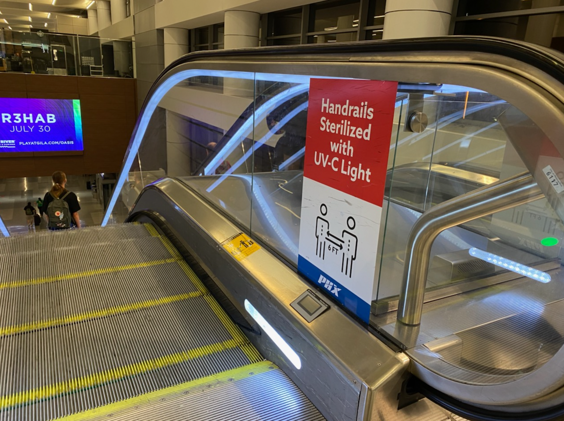 This is a picture of the UV light in action at the Phoenix International Airport. The UV light is said to help with sanitizing the handrails at the airport. Seeing as many people go through the airport every day, I can understand why things like this would want to be sanitized.