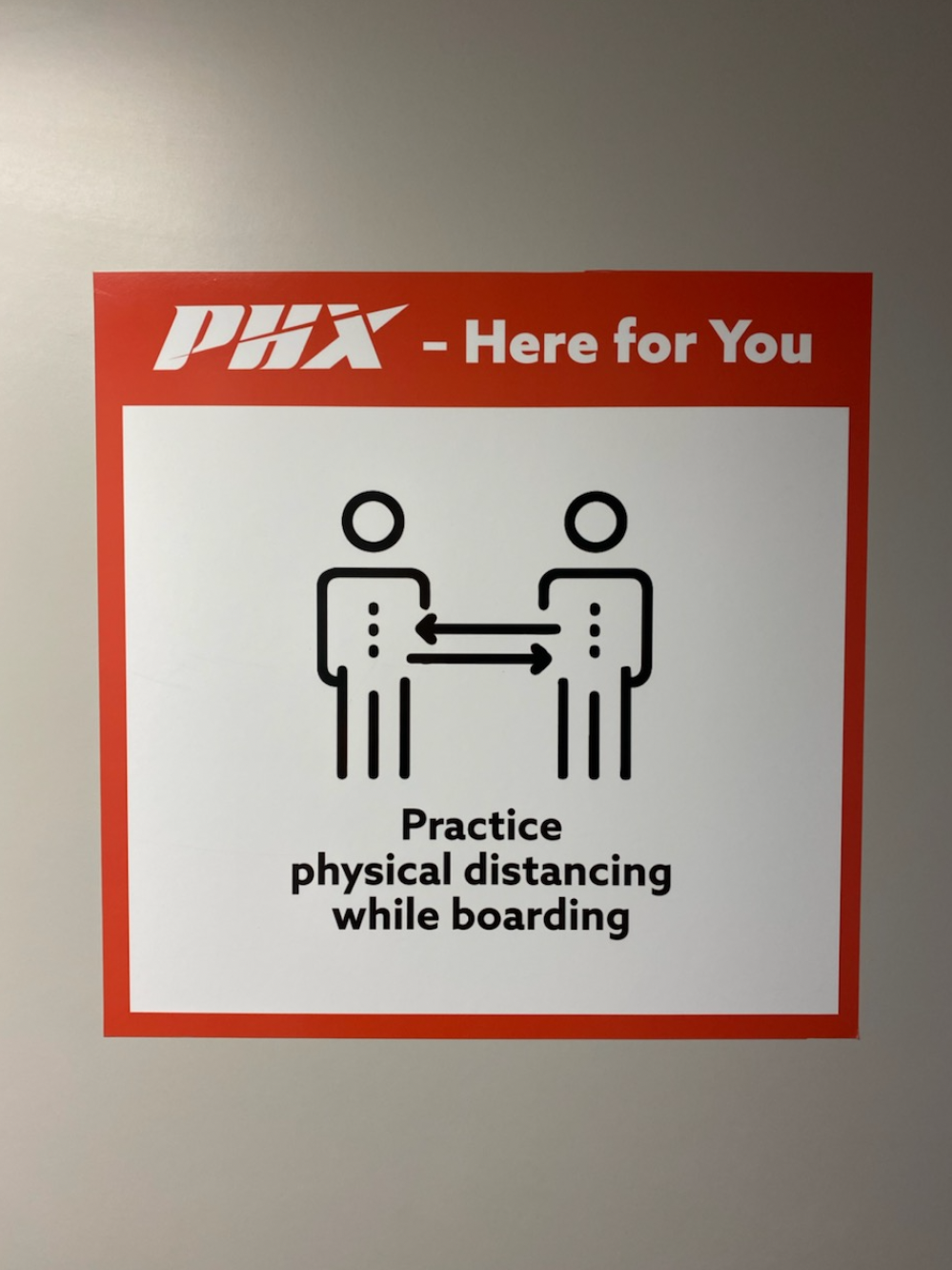 This was a sign at the Phoenix Sky Harbor International Airport. It is a sign reminding people to social distance.