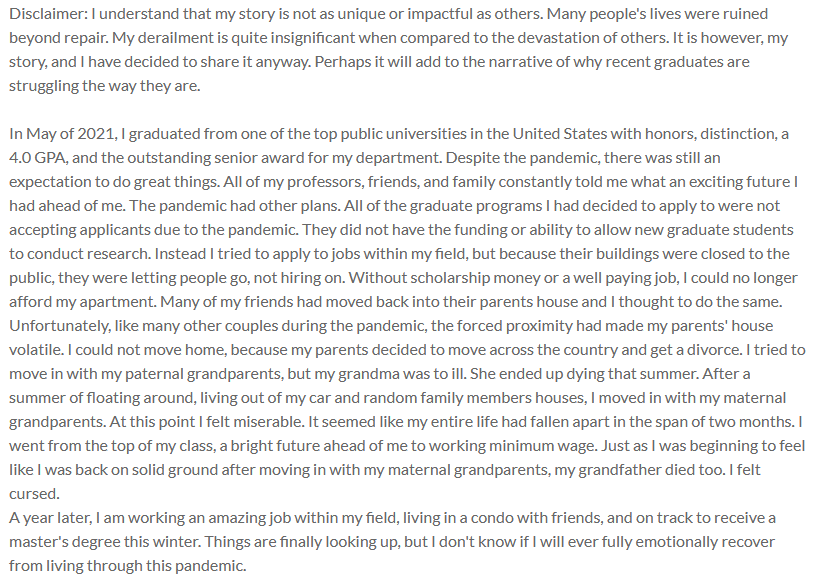 In May of 2021, I graduated from one of the top public universities in the United States with honors, distinction, a 4.0 GPA, and the outstanding senior award for my department. Despite the pandemic, there was still an expectation to do great things. All of my professors, friends, and family constantly told me what an exciting future I had ahead of me. The pandemic had other plans. All of the graduate programs I had decided to apply to were not accepting applicants due to the pandemic. They did not have the funding or ability to allow new graduate students to conduct research. Instead I tried to apply to jobs within my field, but because their buildings were closed to the public, they were letting people go, not hiring on. Without scholarship money or a well paying job, I could no longer afford my apartment. Many of my friends had moved back into their parents house and I thought to do the same. Unfortunately, like many other couples during the pandemic, the forced proximity had made my parents' house volatile. I could not move home, because my parents decided to move across the country and get a divorce. I tried to move in with my paternal grandparents, but my grandma was to ill. She ended up dying that summer. After a summer of floating around, living out of my car and random family members houses, I moved in with my maternal grandparents. At this point I felt miserable. It seemed like my entire life had fallen apart in the span of two months. I went from the top of my class, a bright future ahead of me to working minimum wage. Just as I was beginning to feel like I was back on solid ground after moving in with my maternal grandparents, my grandfather died too. I felt cursed.