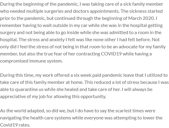 During this time, my work offered a six week paid pandemic leave that I utilized to take care of this family member at home. This reduced a lot of stress because I was able to quarantine us while she healed and take care of her. I will always be appreciative of my job for allowing this opportunity.