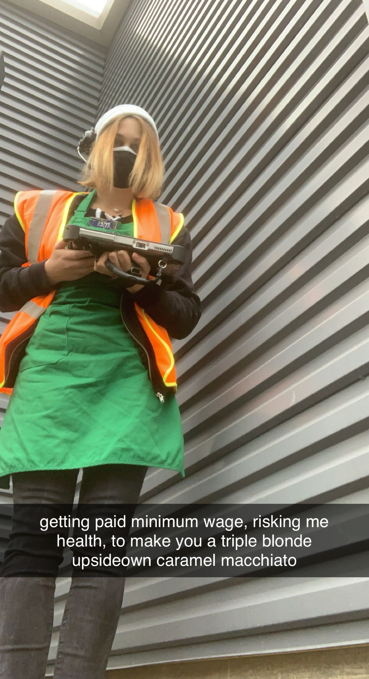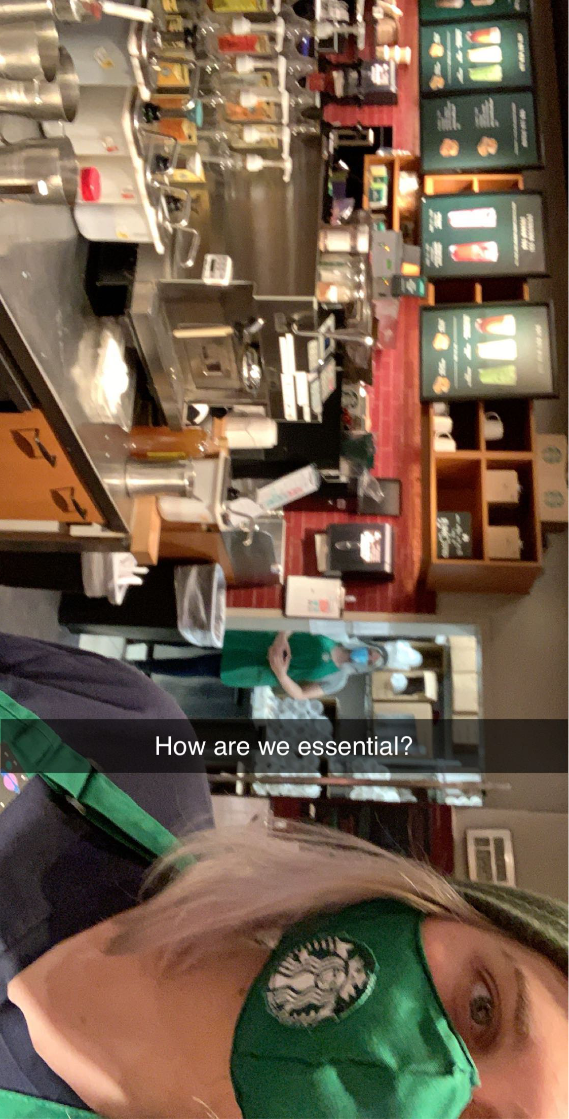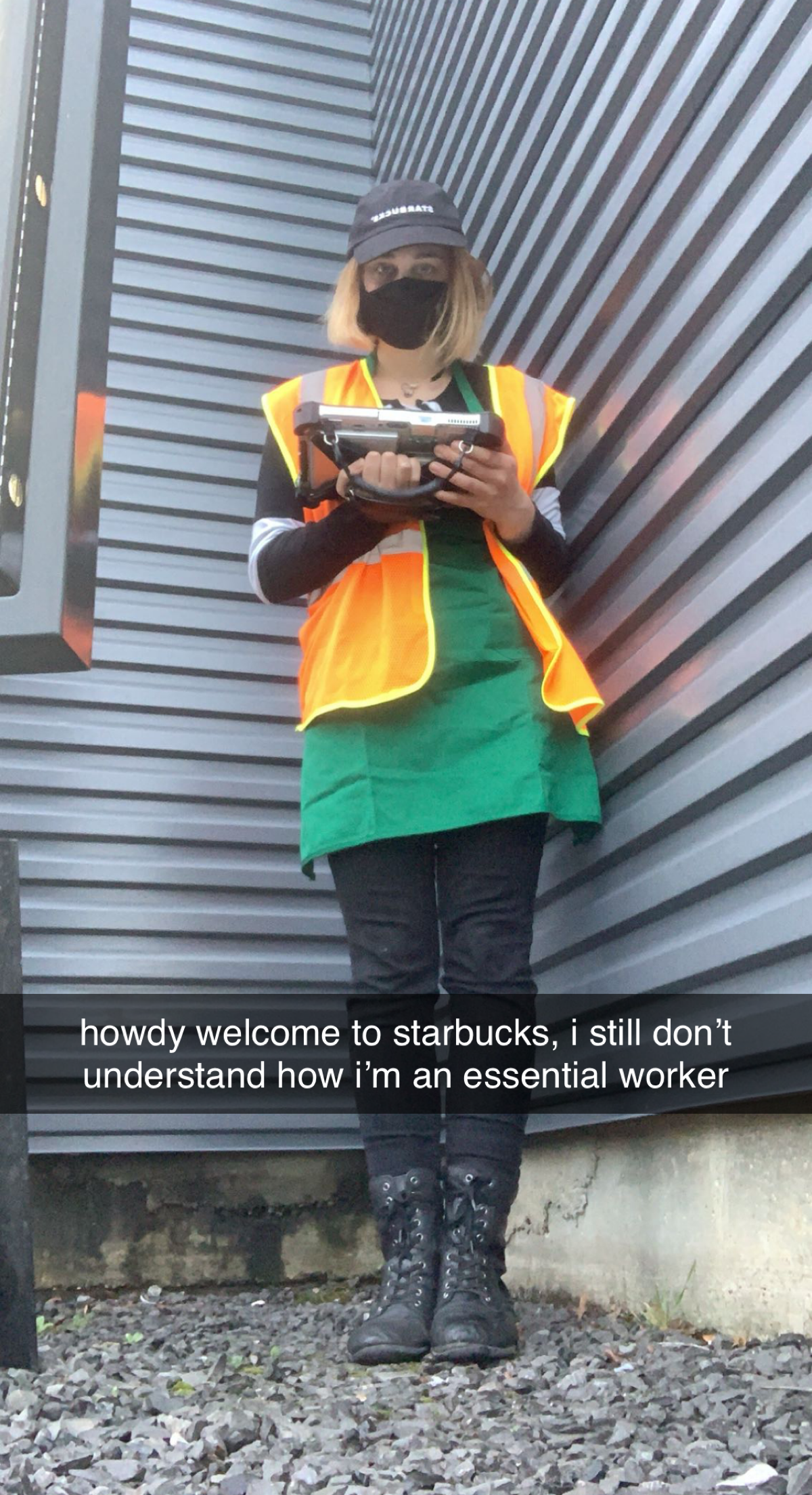 I worked at Starbucks Coffee Company from 2019-2021. The company begging their workers to continuously go to work under awful conditions, with little regard for their safety, took a huge mental toll, not only on me, but every barista. We were told providing coffee to our community was an "Essential" job, when in all reality is was essential for us to work to ensure that company's made a profit. We had to work to pay rent and buy food because the united states government offered little support, but were not justly compensated for our work. These pictures of myself remind me how tired I was working from 3 am to 2 pm, in the middle of a pandemic, in order to be able to afford living.