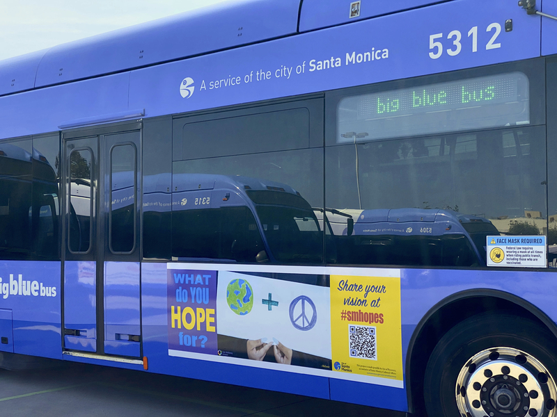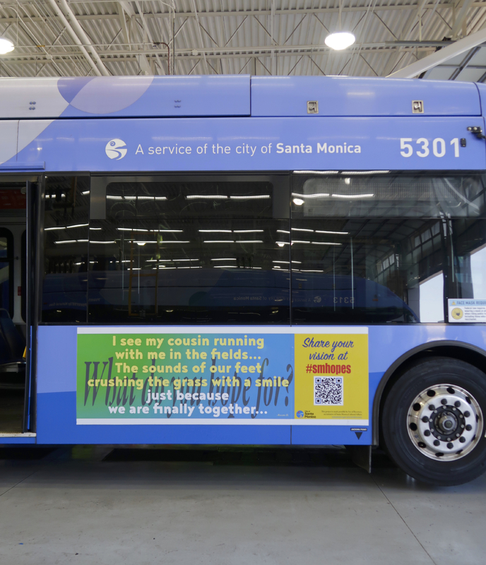 Through a grant from the City of Santa Monica Cultural Affairs Department program, Art of Recovery, artist Paula Goldman designed five banners based on uploads to the project call page on this website, SMhopes: an Archive of Hopes and Dreams. The banners will run on Santa Monica's Big Blue Bus transit system for the month of July, 2022.