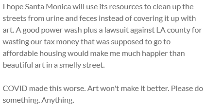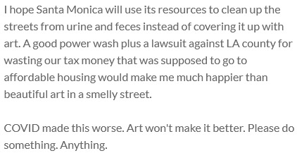 I hope Santa Monica will use its resources to clean up the streets from urine and feces instead of covering it up with art. A good power wash plus a lawsuit against LA county for wasting our tax money that was supposed to go to affordable housing would make me much happier than beautiful art in a smelly street.