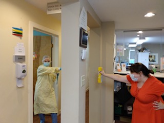 The photo was taken at the beginning of the pandemic, probably a Friday in the summer because I was not wearing scrubs (casual Fridays). I was working in a pediatric office as a medical assistant in Litchfield County, Connecticut. If you know anything about that area, it was scary at the time because all of the families with any means in NYC were fleeing the city and coming to Litchfield and Fairfield Counties. We were quite nervous at the time that they would spread covid to our communities at the same rate as it was in NYC. Luckily it did not happen. It was a scary time, as every day we would get the ding in the morning and the end of the day of an email notification telling us how many deaths were in local hospitals, how many beds were left (spoiler- none), how much PPE was available (again, none) etc. We were so short on PPE we had to reuse our masks for a whole week (unless exposed of course). I can still remember the feeling of the little fabric “firs” that would start to itch my face after a few days, and the nice smelling essential oils we put in them to make wearing them tolerable- I used citrus smells, and my coworker used coconut. The worst was the lack of cleaning and disinfecting products. We tried to not see patients that were even remotely sick with covid symptoms because we did not have enough cleaner to disinfect the rooms after they left. When we were fortunate enough to get a new bottle of Lysol, we would take fun photos like this one of me threatening my coworker whom I suspected was covered in germs. Little moments like this helped to alleviate the stress of the moments when that email ding came in at the end of the day.
