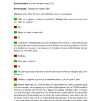 En esta entrevista Rodrigo Hernández Cordero es entrevistado por Carmen Kordick Coury concerniente al covid-19 en Costa Rica. Para empezar, hablaron de los cambios que pasaron desde el ano anterior. Rodrigo es dueño de tienda, hablan de su negocio, de las vacunas y de su deseo de no vacunarse. Hablan del gobierno, del uso de mascarillas y su familia. De allí, hablan de La Caja, el sistema médico y hospitales privados. Rodrigo habla de cruzando fronteras y comparando para su tienda. También de la corrupción del gobierno, vida familiar, salud mental y de los funerales. Para terminar, hablan de la esperanza para el futuro, fuentes principales de noticias y noticias falsas.
