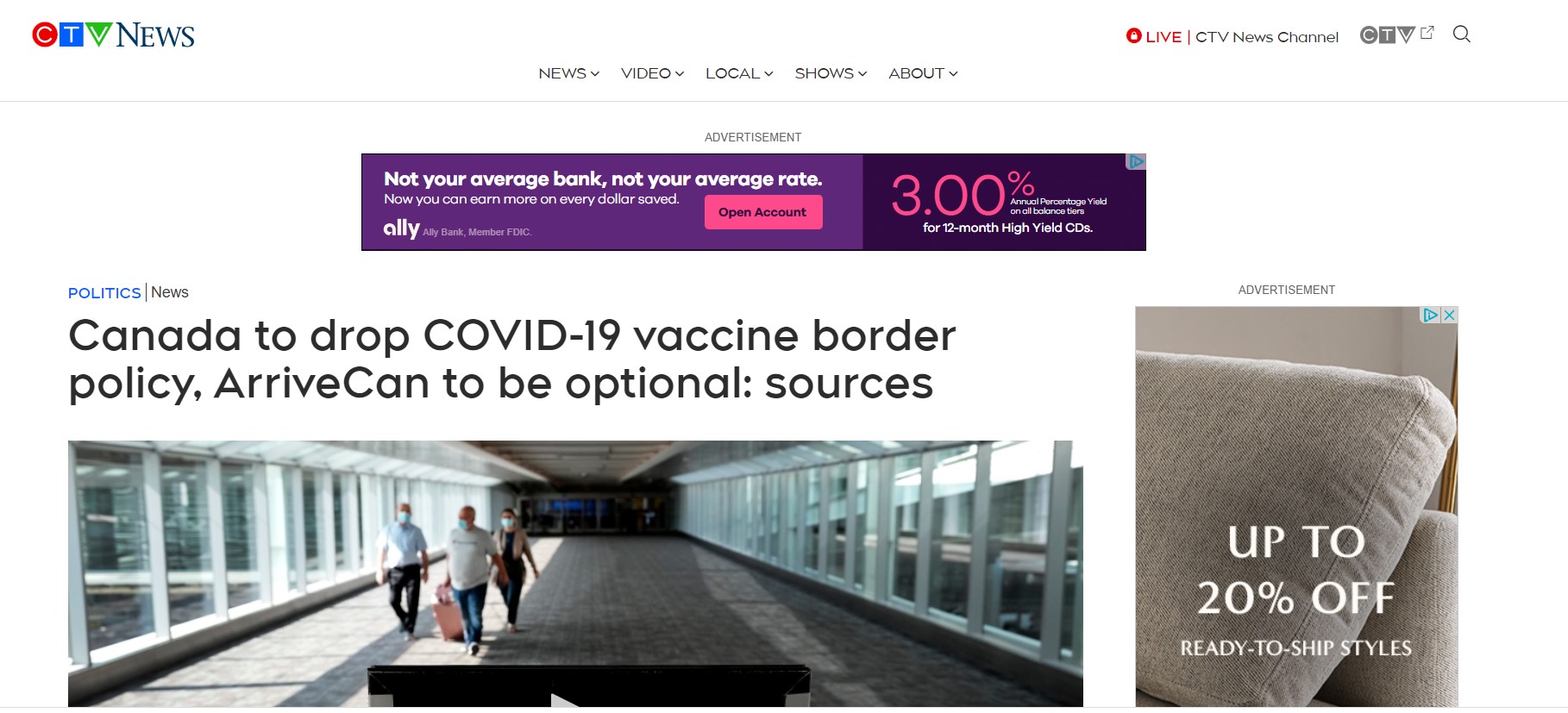 This news article reports Canada's plan to drop its COVID-19 vaccine border requirements, make the ArriveCan application optional, and possibly end COVID-19 testing for travelers by the end of September 2022. This news shows how the COVID-19 pandemic impacted travel and border relations between countries (Canada and US).