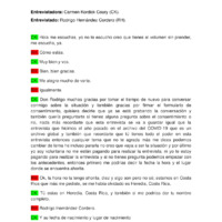En esta entrevista Rodrigo Hernández Cordero es entrevistada por Carmen Kordick Coury concerniente al covid-19 en Costa Rica. Para empezar, hablaron de cosas que han cambiado desde el ano anterior. Hablaron de su negocio, inflación, y el gobierno. De allí hablaron del gobierno, la vacuna, y la mascarilla. Hablaron de La Caja, su vida social, y su familia. De las elecciones, fuentes principales de noticias y estudios cerebrales. Para terminar, hablaron de la juventud y de sus pensamientos del futuro.
