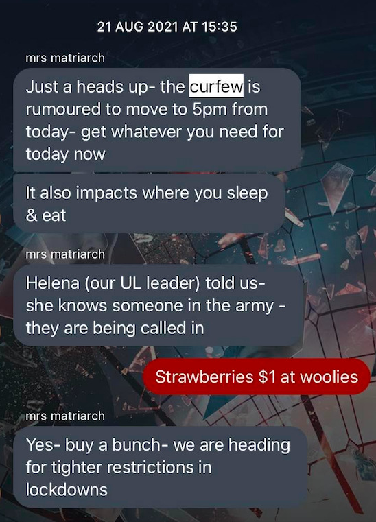 This is a screenshot of a family text conversation in August 2021. The mother, nicknamed “mrs matriarch” on the Facebook Messenger application, is relaying rumours of an intensification of the lockdown restrictions, including the involvement of the military. She also encourages the popular practice of hoarding or panic buying.
