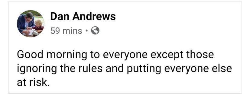 This post exemplifies the Victorian Premier’s ability to co-opt social media trends in promoting his own political agenda. Popular in early 2020, the meme followed the template of “Good morning to everyone except,” followed by exclusion of a relatively a niche social group. This screenshot illustrates the subtle use of social media as propaganda by the Andrews government. Andrews’ social media pages are seldom thought of as such, as the skill of his social media team has allowed him to maintain a popular and likeable social media persona. In an age of ubiquitous social media use, the Andrews government has used social media very effectively to protect its legitimacy and justify its methods. For example, the screenshot highlights the use of guilt by the Andrews government to legitimise health restrictions. The government consistently stressed that the pandemic restrictions were for the benefit of the public and necessitated complete compliance. Those who rejected health advice were endangering the entire community and “putting everyone at risk.” This post therein encapsulates sophisticated government propaganda and the co-opting of social media for political purposes.