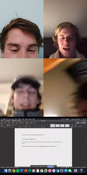My 20th birthday party, held on Zoom. We tried to convince George that his microphone was muted, and he proceeded to abuse us via Microsoft word and the “share screen” function. While they didn’t compare to real life interaction, Zoom provided many new creative ways to converse which we had a lot of fun exploring.