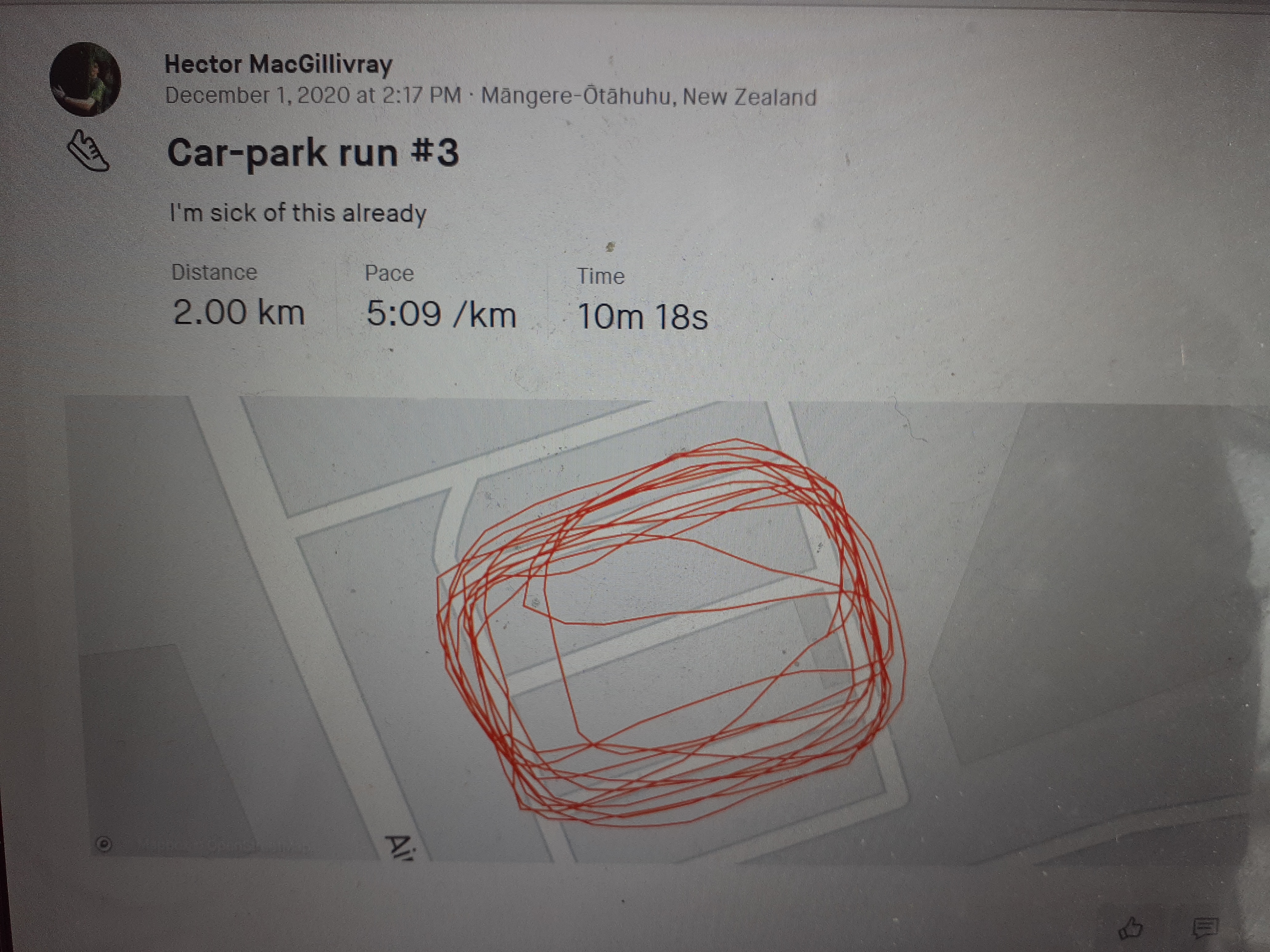To return to New Zealand in late 2020 I had to complete 14 days of hotel quarantine. Luckily, my hotel had a fenced off area of the carpark that we were able to use for exercise for an hour each day. This strava activity shows a run I did around the very small carpark (one of six during the two weeks), which involved running in my mask and staying a few meters from the other people in the space. Without these bursts of activity, two weeks in a hotel room would have been much less bearable.
