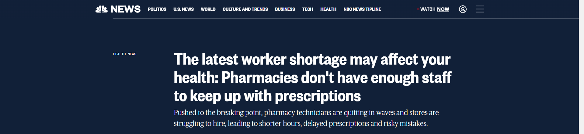 This NBC article goes into detail about the shortage of pharmacy technicians as a result of COVID-19. Drug shortages, staffing shortages, increased demand, and additional responsibilities with little to no training or compensation led to burnout.
